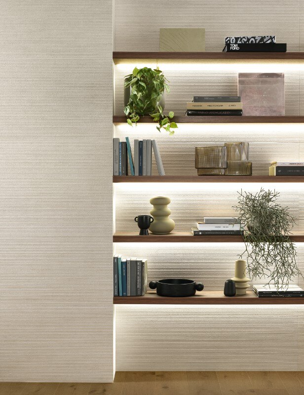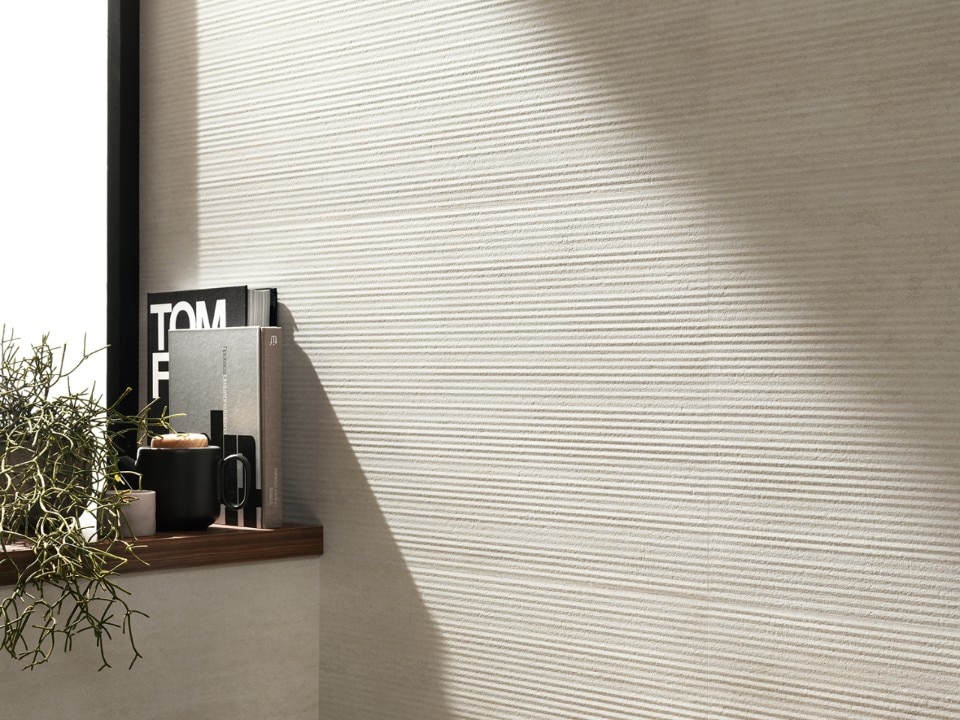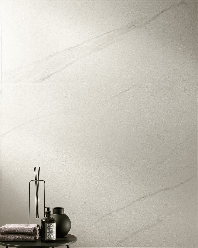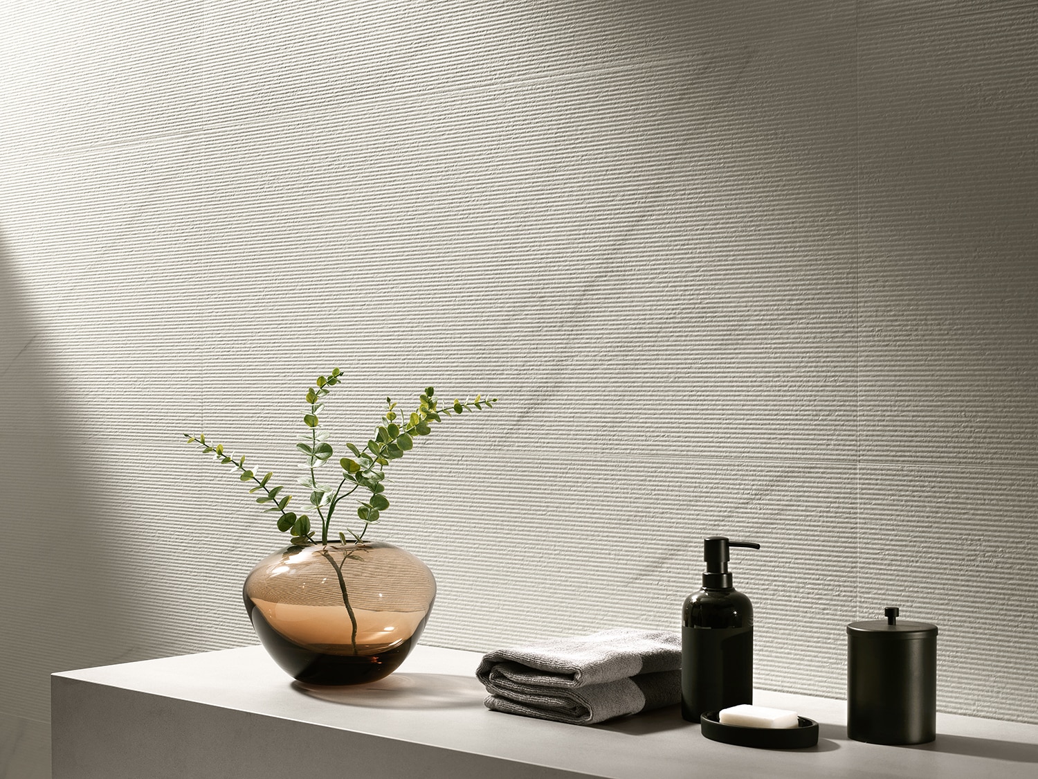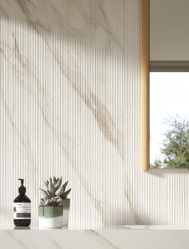 3D Crease si contraddistingue per una lavorazione geometrica, moderna e sofisticata che offre al marmo nuove opportunità architettoniche in una veste più contemporanea. L’effetto tridimensionale appare e scompare a seconda dell’illuminazione e del verso di posa, creando interessanti chiaroscuri da lontano, mentre da vicino la texture lievemente bocciardata rende la superficie realistica e scultorea. Field presenta un fondo con una lieve struttura tridimensionale e una finitura matte che rendono questa superficie discreta ed elegante, quindi perfetta per la posa a parete. La tecnica di smaltatura all’avanguardia utilizzata per la sua realizzazione fa sì che la superficie sia piacevole al tatto. La finitura Field può essere utilizzata da sola come rivestimento per le pareti, donando all’ambiente una forte personalità, o abbinata al pavimento coordinato di altre collezioni di Atlas Concorde. 3D Reed ha un rilievo più materico, irregolare e naturale, interrotto dalle imperfezioni dell’incisione manuale: riproduce il tocco artigianale e l’effetto ottenuto a seconda della durezza del materiale d’ispirazione. È una soluzione duttile che permette all’architetto di esprimere la sua creatività: il verso di posa e l’illuminazione dell’ambiente influiscono in maniera decisiva sulla resa finale consentendo di creare molteplici effetti. La posa in verticale delle lastre, in particolare, data la natura del rilievo, nasconde completamente le fughe.