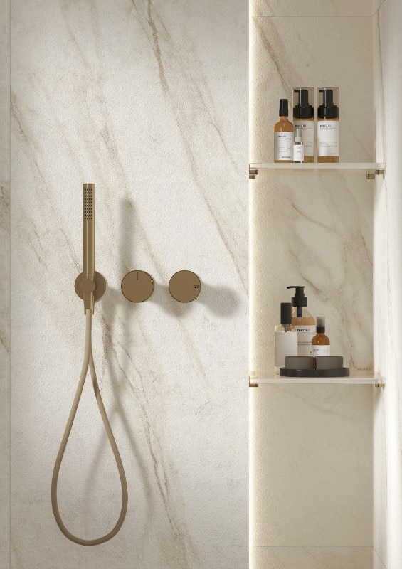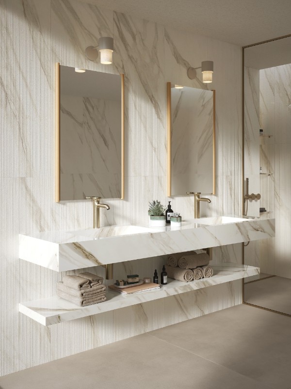 La serie Marvel 3D ha origine da cinque essenze di grande eleganza e attualità, tratte da marmi già presenti nel mondo Marvel: Marvel Meraviglia, la collezione che prende il nome da Calacatta Meraviglia, il marmo a cui si ispira e che dona all’ambiente in cui è inserito un’eleganza sussurrata, e Marvel Travertine, in cui la maestosità del marmo travertino rivive sulle piastrelle in gres porcellanato. Armonia cromatica e raffinatezza sono il denominatore comune dei cinque fondi, che presentano una leggera lavorazione materica. Calacatta Meraviglia, con vene grigie rade e slanciate, e Calacatta Bernini, pregiato marmo apuano, esaltano la bellezza dei marmi bianchi; Light Majestic propone un compatto fondo grigio chiaro, caratterizzato da intense vene tono su tono; Travertine Sand e Travertine White offrono, invece, due differenti interpretazioni del travertino. Da un lato un beige caldo, con dettagli avorio e nocciola, dall’altro tonalità più chiare, con delicatissime sfumature color sabbia.