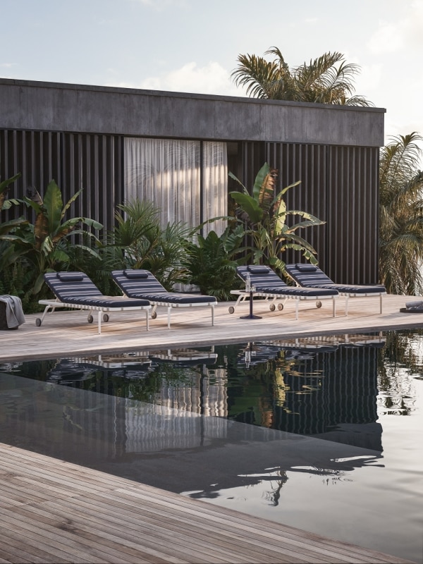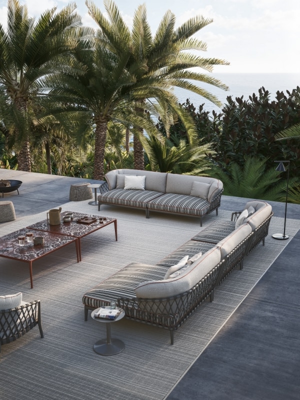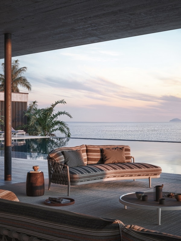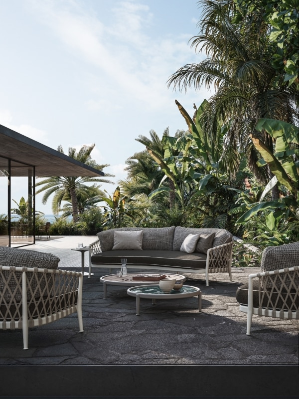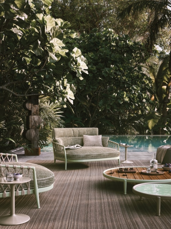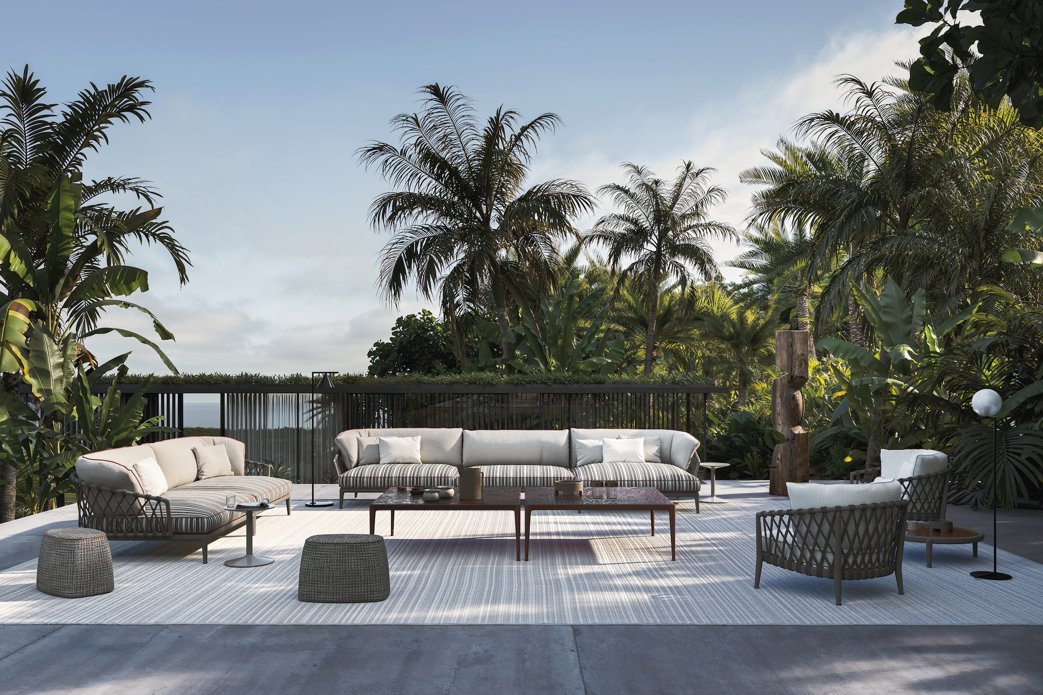Ma la ricerca di B&B Italia va avanti, e l’ultima evoluzione di Erica segna un ulteriore passo verso la dimensione di sistema, allargando il repertorio di arredi, finiture e texture. La prima novità è il divano curvo, pensato per configurazioni più fluide e conviviali, affiancato da un articolato programma modulare che moltiplica le possibilità compositive e progettuali. A questi si aggiungono dormeuse, poltrone e daybed con schienale alto e poggiatesta integrato, soluzioni che interpretano il relax outdoor con un comfort sempre più architettonico.