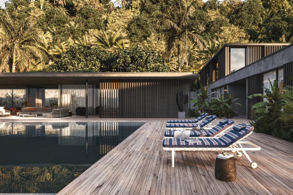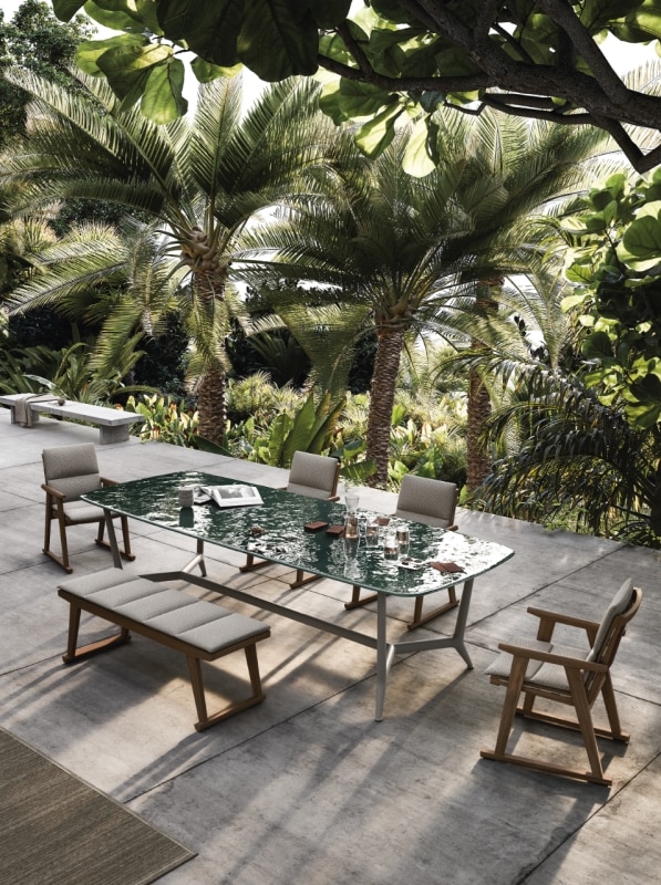 L’ampliamento coinvolge anche la zona dining e gli arredi di servizio: tavoli e coffee table con piani in teak naturale o in vetro fuso retroverniciato – nelle tonalità verde giada, verde smeraldo e rosso corallo – dialogano con le nuove finiture per le strutture, tra cui bianco panna, verde acquamarina e bronzo oliva. I lettini impilabili uniscono praticità e qualità costruttiva, mentre una rinnovata proposta tessile, tra righe e tinte unite coordinate, aumenta ulteriormente il livello di personalizzazione.