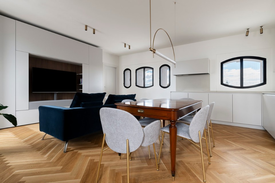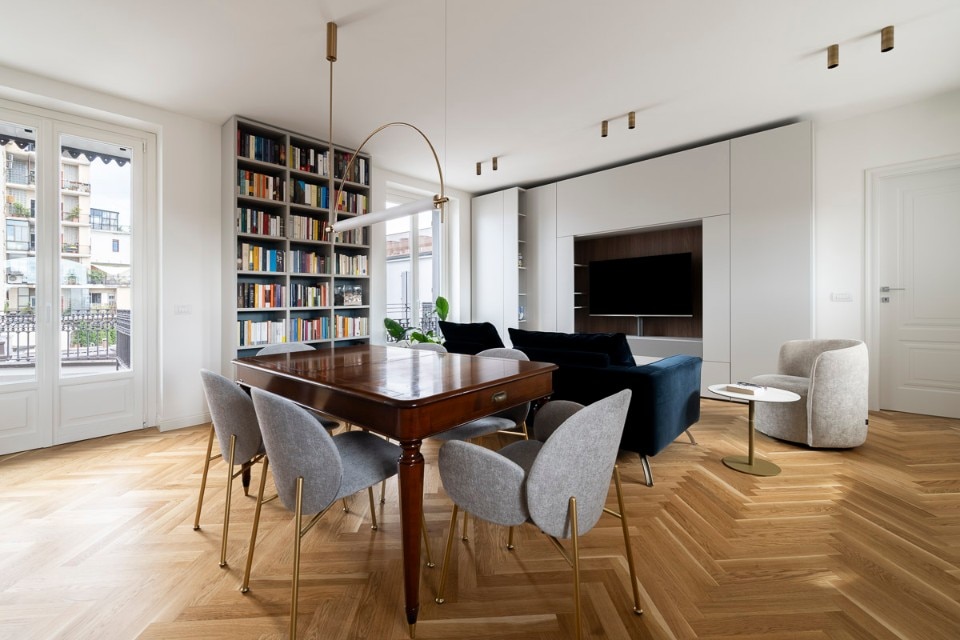 Il lavoro di riorganizzazione degli spazi, la scelta degli arredi e l'illuminazione sono stati determinanti nel conferire nuova forma all’appartamento, con un focus particolare sulla funzionalità e l'equilibrio estetico. In questo contesto, particolare attenzione è stata riservata alla progettazione di elementi custom e soluzioni versatili e personalizzate.