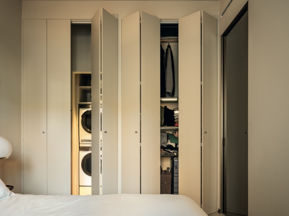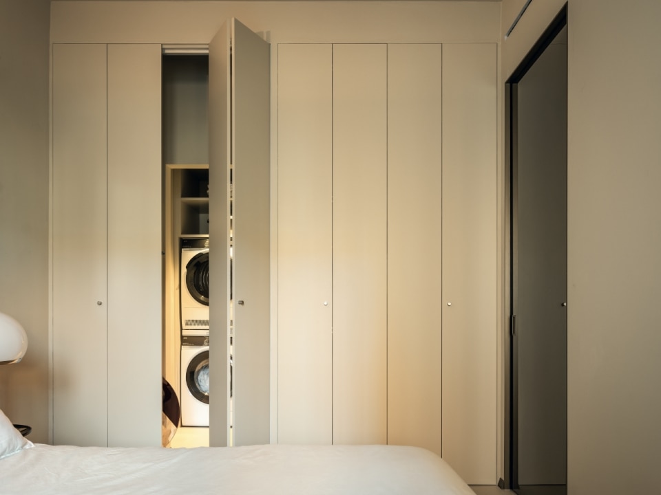 Gli sportelli filo muro garantiscono una perfetta continuità tra anta e parete e sono pensati per un pratico uso quotidiano attraverso aperture anche push-pull completamente invisibili. Il tutto con l’obiettivo di offrire un prodotto che sia funzionale e al tempo stesso elemento d’arredo. Così, per esempio, nel progetto di ristrutturazione di un’abitazione milanese mostrato in questa pagina, l’intera parete di una camera da letto si trasforma in una quinta uniforme: una sequenza di ante complanari, prive di cornici e stipiti a vista. L’effetto è quello di un volume compatto, senza interruzioni visive, che al suo interno cela spazi essenziali.