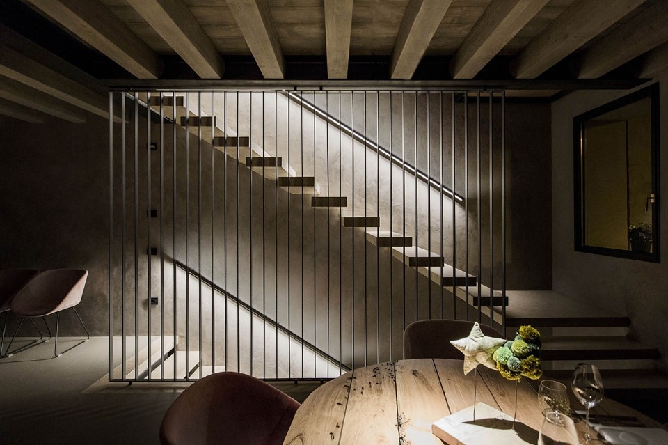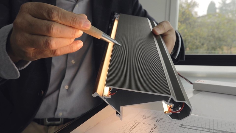 Michele Marcon ha disegnato una sezione particolare, che permette l’inclusione di una doppia sorgente luminosa: nella parte inferiore di Ottomano si trova la sorgente luminosa che illumina i gradini, rendendoli sicuri da percorrere; verso l’interno del corrimano si trova una seconda striscia a LED in direzione della parete, pensata illumina tutto il vano scale evitando l’abbagliamento.