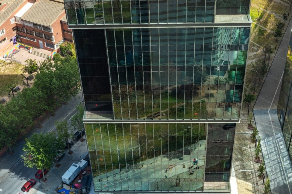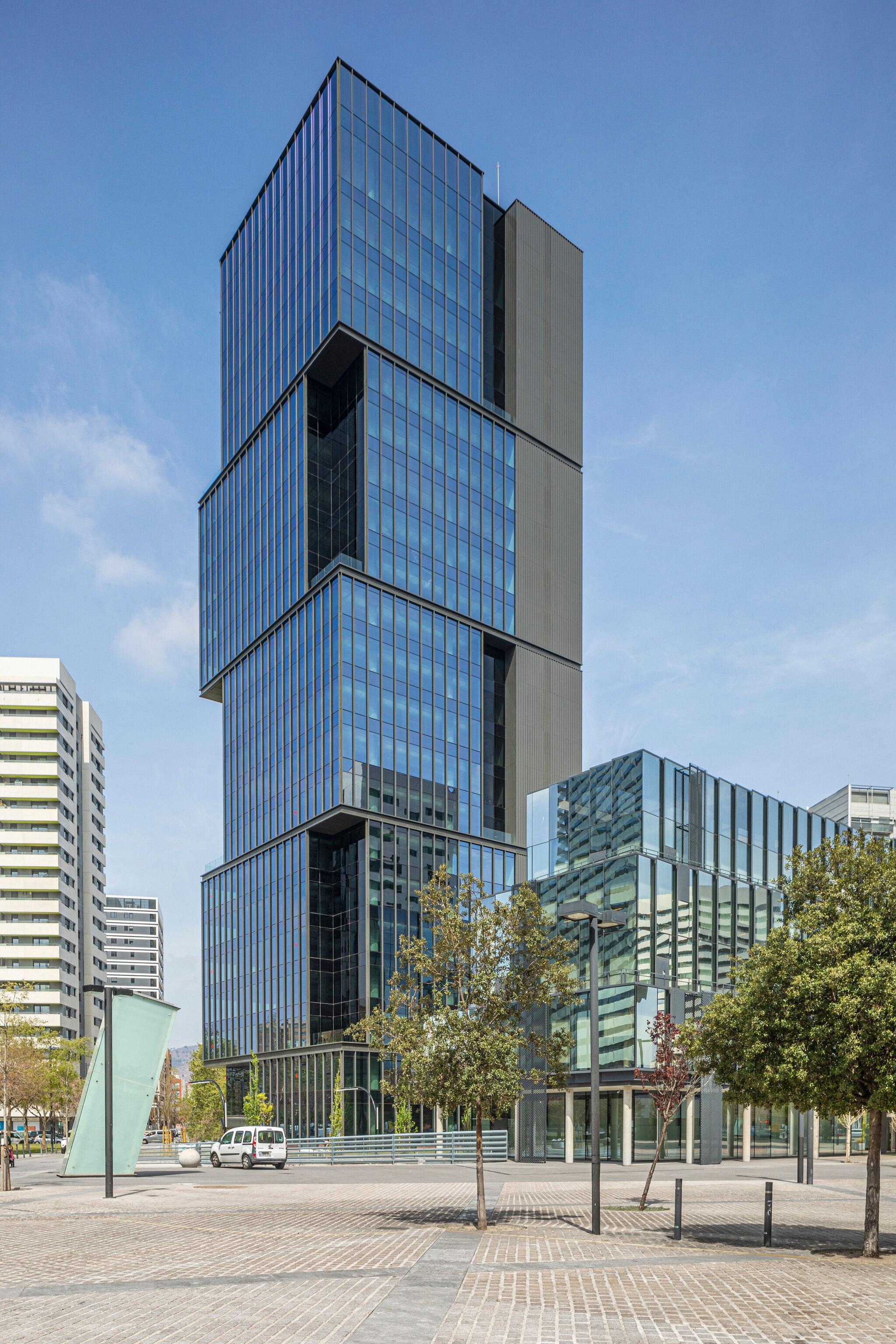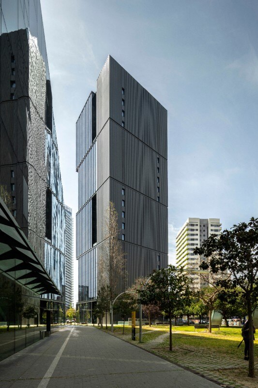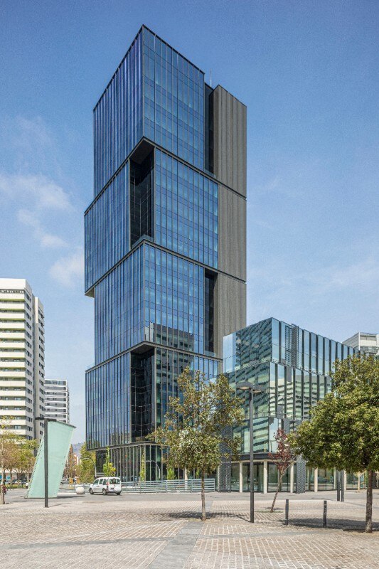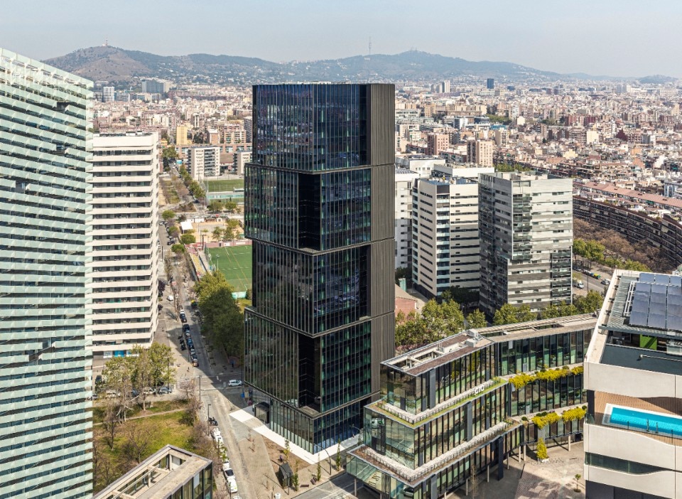 La torre alta 21 piani si distingue per una composizione audace: quattro volumi sovrapposti in modo sfalsato generano una percezione dinamica delle masse e movimentano lo skyline della città catalana. Le terrazze aperte su più livelli regalano visuali panoramiche sulla città, mentre le soluzioni costruttive puntano alla sostenibilità, come dimostra la certificazione Leed Gold ottenuta dall’edificio.