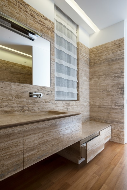 Trovata la materia prima, la costruzione della villa, nella progettazione firmata dall’architetto Massimo Luporini, ne accompagna le potenzialità. Il travertino in recisa copre le facciate e la falda riveste i pavimenti, dando vita a un monumentale blocco di pietra dalle linee contemporanee, in grado di dialogare con altri materiali come teak, vetro e metallo, integrandosi nelle verdi colline che guardano il lago di Massaciuccoli. I pavimenti di pietra accompagnano anche all’interno, dando luminosità a corridoi e alla zona giorno grazie alla selezione del materiale e al grande formato. Nell’ottica del massimo rispetto della materia, nei bagni sono proposti i mobili Le Cave, sempre di Vaselli, che con i fianchi e le ante di travertino Becagli in recisa si integrano alla perfezione con il resto del bagno. Grazie all’attenta progettazione e alla cura nelle fasi di taglio, con le lastre ricostruite che si specchiano nelle pareti, i mobili sembrano emergere dal rivestimento come parte integrante di esso. Per godersi lo splendido panorama, oltre alle grandi vetrate, il progetto ha previsto una piscina, sempre di travertino Becagli, con zona relax dotata di chaise lounge e idromassaggio collegata a una corsia per il nuoto.