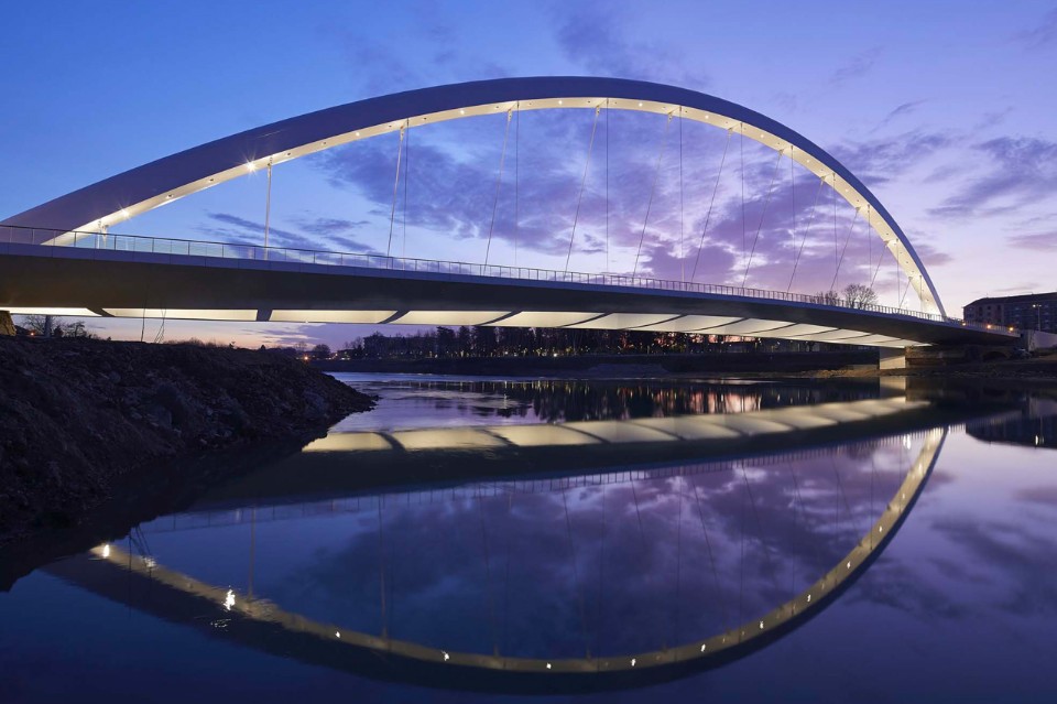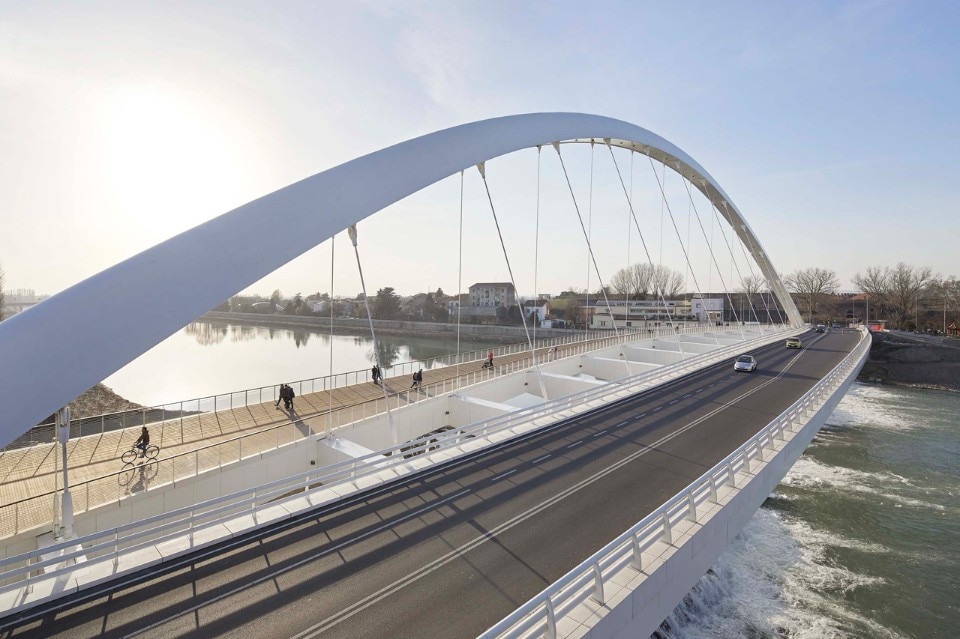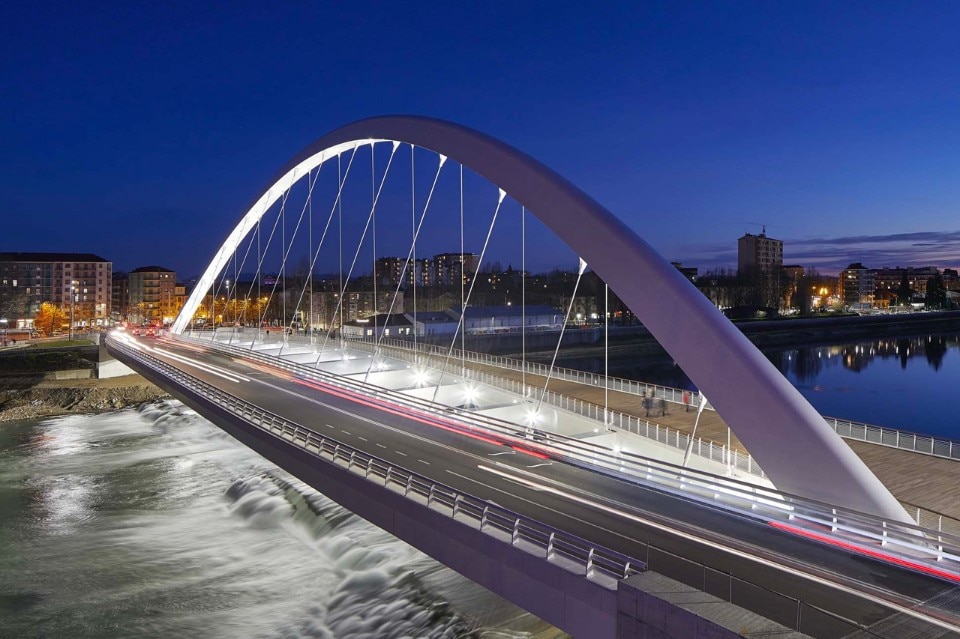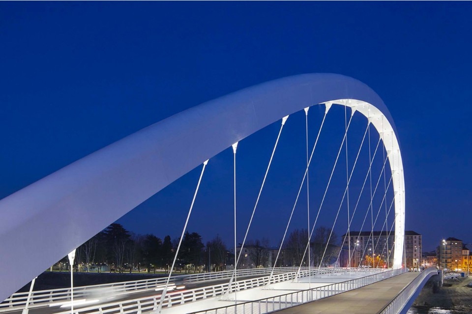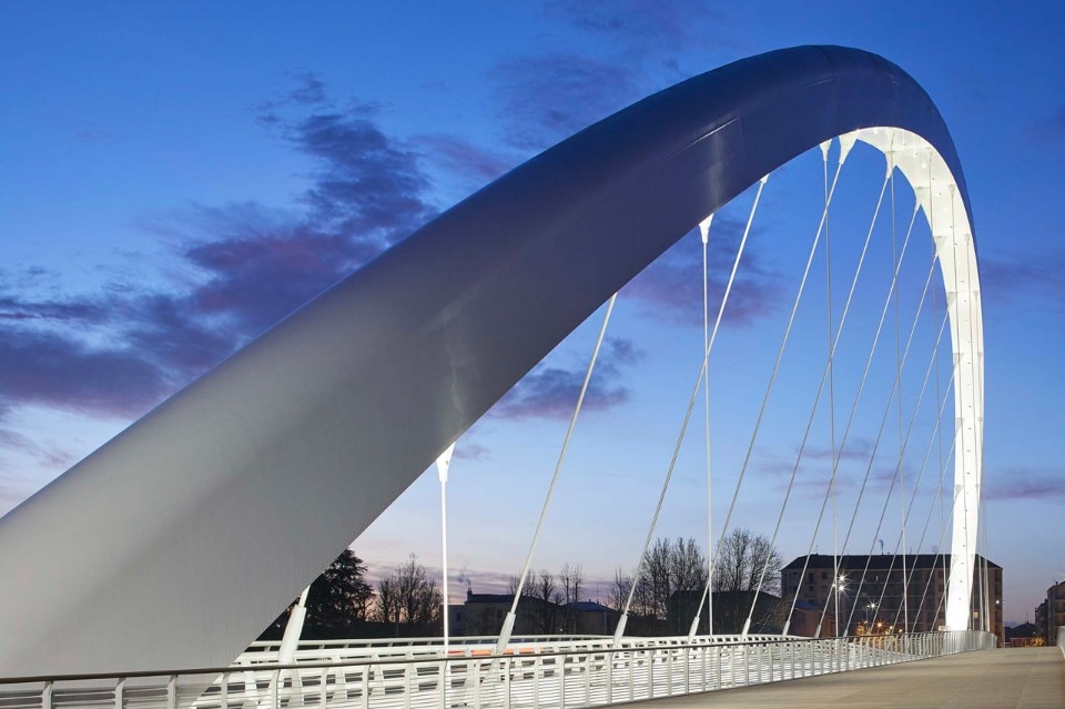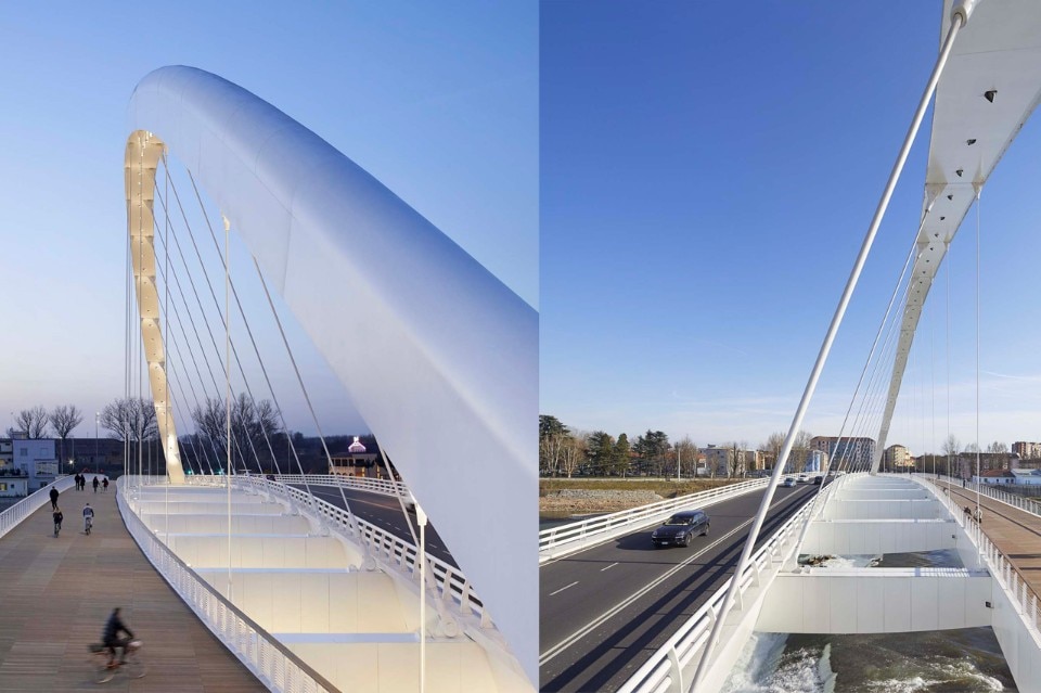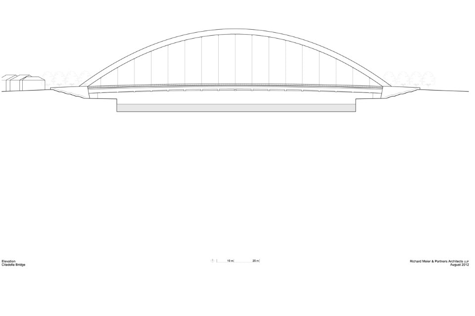 Richard Meier & Partners ha completato il suo primo ponte pedonale e veicolare. Con una superficie di circa 4.150 metri e una lunghezza di 185 metri, il nuovo ponte Cittadella è una struttura moderna in cemento prefabbricato e acciaio verniciato sul fiume Tanaro, progettata per collegare la città di Alessandria con la cittadella del XVIII secolo.