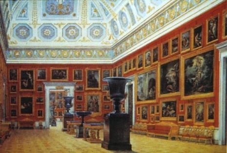 Veduta di una sala dell’Ermitage, San Pietroburgo. Acquarello del 1800