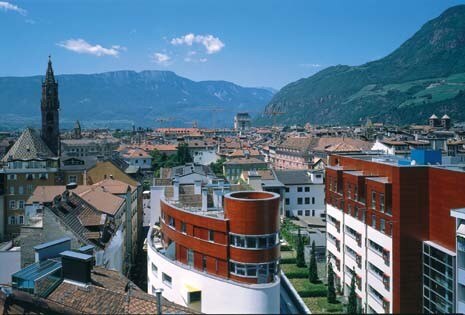 Il progetto, nel centro di Bolzano, ha integrato edifici storici con nuovi blocchi. Il complesso, che comprende un centro commerciale, abitazioni, uffici e lo storico hotel Greif, si articola intorno a una lunga galleria coperta. A destra, i collegamenti verticali che dalla piazza portano al livello del centro commerciale e del passaggio coperto