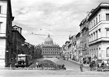 Rarissima fotografia con la prova al vero del “nobile interrompimento” progettato da Piacentini e Spaccarelli, montata su carrelli che avrebbero permesso di avvicinarla e di allontanarla. Fu invece subito disfatta, dicembre 1938