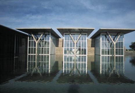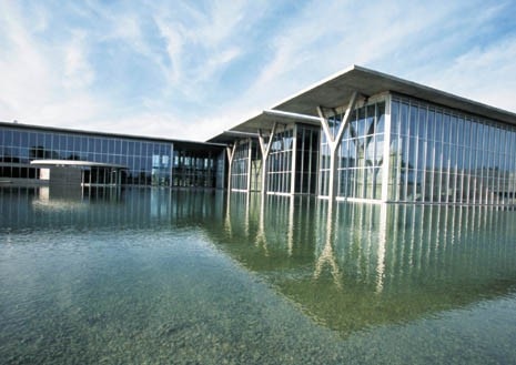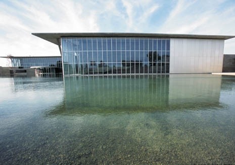 Il marchio di fabbrica? L’immensa copertura a sbalzo – una colata di cemento – sorretta da 5 pilastri in acciaio a forma di “Y”, alti 12 metri. Dal tetto, grazie a un sofisticato sistema di vetrate e lucernari, la luce che filtra nelle gallerie è in gran parte naturale. Tutt’attorno, l’acqua di uno stagno artificiale circonda l’edificio.