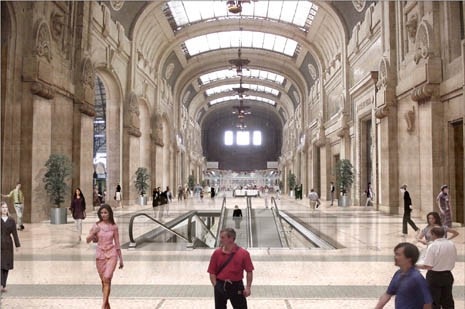 L’atrio delle biglietterie sarà ripulito e pensato come piazza urbana, per concerti, mostre, incontri, usi di carattere temporaneo. Il flusso principale dei viaggiatori verrà deviato rispetto a questo spazio e ridisegnato per mezzo di tapis-roulants. Il concetto di biglietteria cambierà: 3.000 mq di ambienti climatizzati con desk e biglietterie automatiche, più simili a quelli delle agenzie di viaggio, elimineranno la separazione tra viaggiatore ed operatore. La prima fase di intervento, quella descritta nel progetto, si limiterà al fabbricato viaggiatori, mentre una fase successiva si occuperà di tutti gli enormi spazi dei depositi sotto i binari da adibire a funzioni più legate alla città. Il restauro della parte monumentale e della Palazzina Reale, che prevede il ripristino delle volte (che sono rette da una struttura metallica) e un loro consolidamento con fasciature in fibra di carbonio, è già cominciato in accordo con la Soprintendenza.