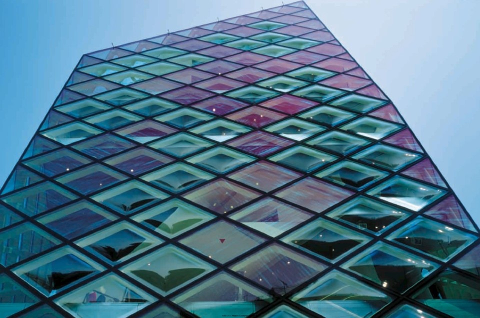 La torre ha una ‘coda’, uno stretto muro a nastro che si snoda lungo il margine del sito e lo ripara dai vicini, ma non si pone in modo ostile nei loro confronti. La finitura di questa ‘coda’ è davvero particolare: una pelle di muschio verde spunta attraverso piccoli blocchi quadrati, creando un motivo vagamente azteco. E questo dà la chiave per capire l’edificio con i suoi molteplici riferimenti a materiali naturali e a forme organiche, con il suo ondeggiare dal liscio al grezzo, dall’aderente all’ampio. Nella torre si trovano quattro diversi tipi di vetri: alcuni piani e trasparenti, altri intagliati per schermare i camerini di prova, i quali sono tutti addossati ai bordi della struttura a forma di cristallo.