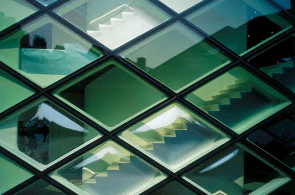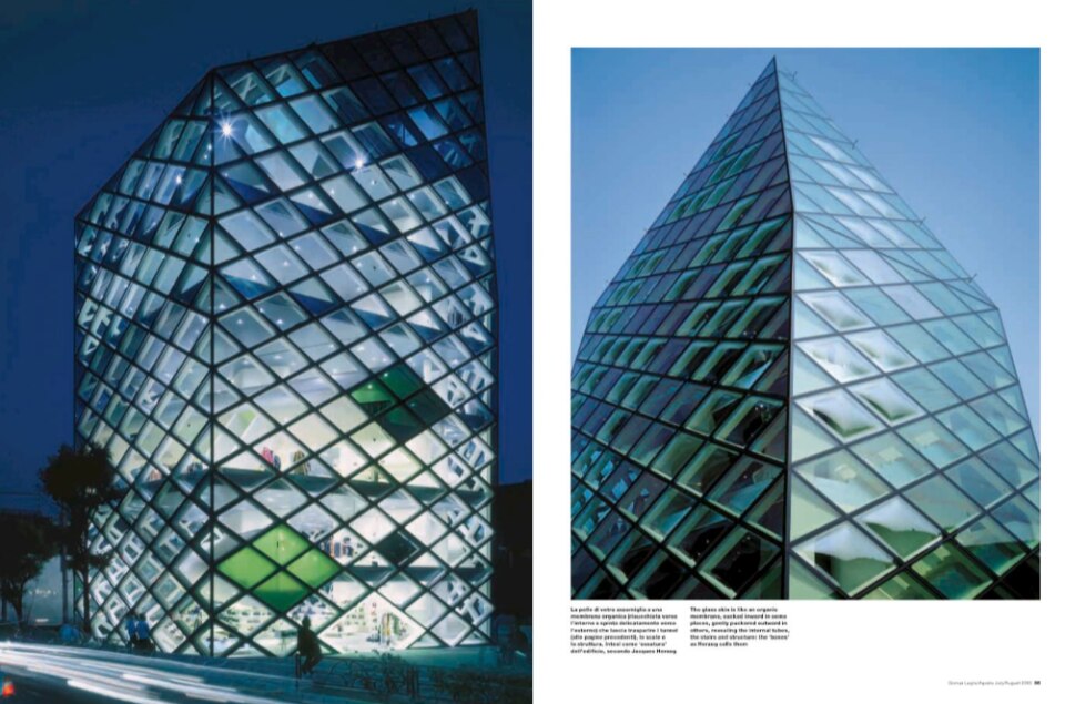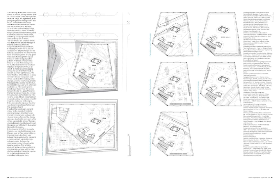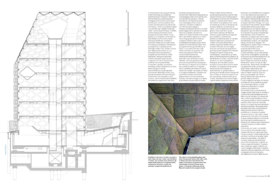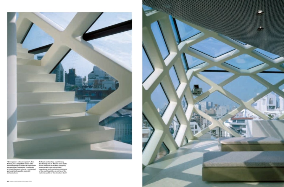 Herzog e de Meuron hanno in un certo senso raggiunto la velocità di crociera. Ogni loro progetto si fonda e si riallaccia in modo brillante al lavoro già fatto, ogni edificio esprime un modo nuovo di guardare all’architettura. Il negozio Prada di Tokyo viene immediatamente dopo quello ormai celeberrimo di Koolhaas a New York. Il progetto di Herzog e de Meuron a Tokyo, il cui costo è stimato in 80 milioni di dollari, ha superato i 50 milioni del negozio di New York, ma architettonicamente e urbanisticamente parlando è senz’altro il più ambizioso e il più raffinato, oltre che gradevolmente immune da iperboliche stravaganze.