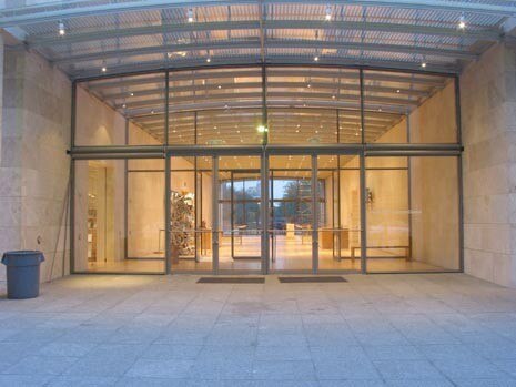 Cinque padiglioni bassi di travertino – fatto arrivare dall’Italia e invecchiato ad arte – vetro, acciaio e legno di quercia. E, ancora, l’invenzione più sorprendente del progetto, il tetto: coperto da una membrana di alluminio capace di filtrare la luce del sole lasciando entrare solo quella proveniente da nord (escludendo cioè la luce del sud, dai raggi ultravioletti troppo intensi).