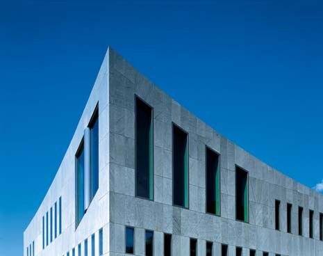A Vaduz però, dove lo sguardo finisce sempre sui circostanti prati e foreste, colline e rocce, questa pietra ha una relazione diretta con il paese. Infatti una generale sensazione grigio-verde caratterizza i dintorni. La “pietra verde” del Centrum Bank si sposa con questo scenario, in una convincente simbiosi colorata. Un motivo che ha convinto anche il committente: ogni singola lastra destinata alla facciata è stata accuratamente scelta, dopo averne scartato il 50% perché contrastante col verde che si desiderava per questo corpo omogeneo. Malgrado sembri una pietra tagliata, l’edificio sorprende per la sua forma particolare. Costruito a forma di cubo, acquista dinamismo grazie alla linea arcuata del tetto e all’inclinazione delle pareti.