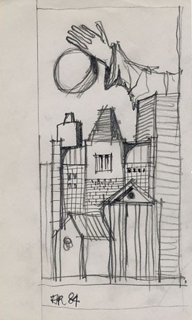 Matita, pastelli e colori ad olio: Aldo Rossi lavorava così ai suoi progetti, partendo da uno schizzo concettuale dal tratto quasi infantile. Le tavole finali – non tele ma stampe eliografiche – possedevano però l’apparenza, l’odore intenso dei dipinti tradizionali.