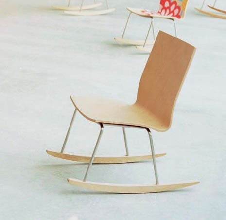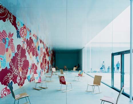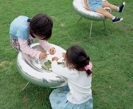 Le sedie, le panche, gli sgabelli che punteggiano l’architettura del museo sono il segno tangibile dell’invito alle persone a fermarsi e sostare. Nel caso della SANAA Chair, concepita in occasione del progetto per il Park Café di Furukawa del 1998, il profilo della sua forma, costruita con solidi e sottili dischi di lamiera d’acciaio e tondini di ferro, riflette una forte chiarezza formale, come se di fronte all’immagine ‘tradizionale’ di una normale sedia a quattro gambe la mano del progettista si fosse fermata semplicemente a ricalcare il disegno della sua anima. Le altre sedute sono state concepite per l’occasione. Nella Rocking Chair il confronto è con un’icona del moderno e del pensiero organico: la sedia in compensato curvato. Il disegno dell’oggetto pare voler inglobare a sé l’opera di Michael Lin che fuoriesce dalla parete per continuare sulla superficie delle sedie stesse, e cercare una fusione con l’ambiente. Il movimento a dondolo introduce poi una insolita forma di percezione dinamica indipendente dal normale atto del camminare lungo le sale. All’esterno è disposta una infilata di posti a sedere (Drop): atolli argentati sospesi su sottili gambe in tondino d’acciaio. Il cielo si riflette sulla superficie concava della seduta quasi a formalizzare l’invito a fermarsi e prendere il sole mentre il museo, di fronte, si anima di presenze.