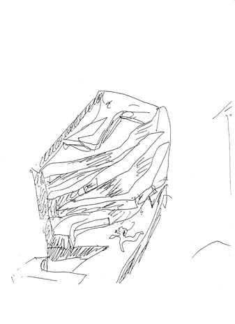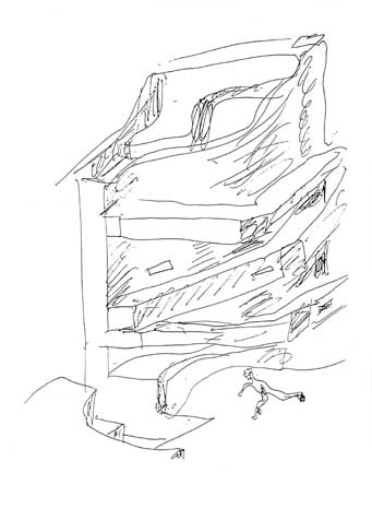 Nell’angolo opposto del pianterreno, che sarà occupato dalla reception e dal punto vendita del museo, una fenditura convessa genera la piattaforma di servizio coperta e coopera con le aeree rampe ad alleggerire il denso volume dei quattro piani del museo - allargandosi verso l’alto, diviene un felice contrappunto al piano inclinato. Torna di nuovo in mente il Guggenheim di Wright, ma anche i musei di Niemeyer a Caracas e Niterói. Tuttavia, a differenza della monotona geometria che caratterizza questi ultimi, un cono invertito e ritorto, una piramide rovesciata e una tazza, nell’ordine, e l’unione delle rampe alle estremità enfatizzano due momenti di verticalità ma anche di simmetria diagonale, dando così vitalità alla stratificazione delle facciate principali, la cui figuratività viene accentuata dai semplici prospetti verso la collina.