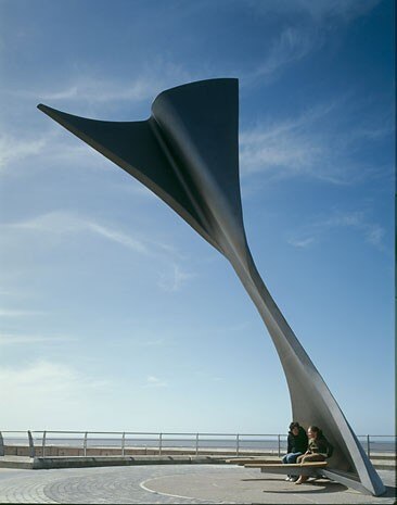 Un elemento, però, sembra sfuggire a questa visione turistica della città che, spesso, rasenta il kitsch. È una lama sottile, alta 8 metri, dall’andamento curvilineo, che fluttua nell’aria come una frusta, per poi infilzarsi a pavimento nella passeggiata a mare della città. Progettata da Ian McChesney, è anche il risultato di un concorso indetto da Public Art North West, ente che promuove e realizza opere d’arte pubbliche nelle zone di Manchester, Liverpool e Blackpool. È un lavoro d’arte certamente, ma allo stesso tempo si presta al gioco: si muove secondo la direzione del vento prevalente, proteggendo con il suo guscio i passanti.