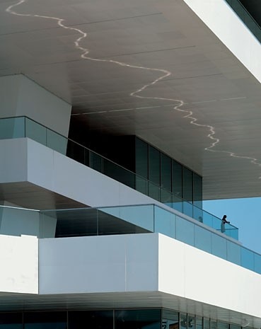 Per quanto riguarda infine la gamma cromatica dei materiali, si limita a una base in cemento scuro per l'adiacente struttura del parcheggio, a un rivestimento in acciaio bianco, al vetro. Per Chipperfield è l'ingresso in un nuovo territorio del progetto, con una tipologia architettonica inconsueta, guidata dalla voglia di spettacolo del committente ma realizzata con sensuale compostezza.