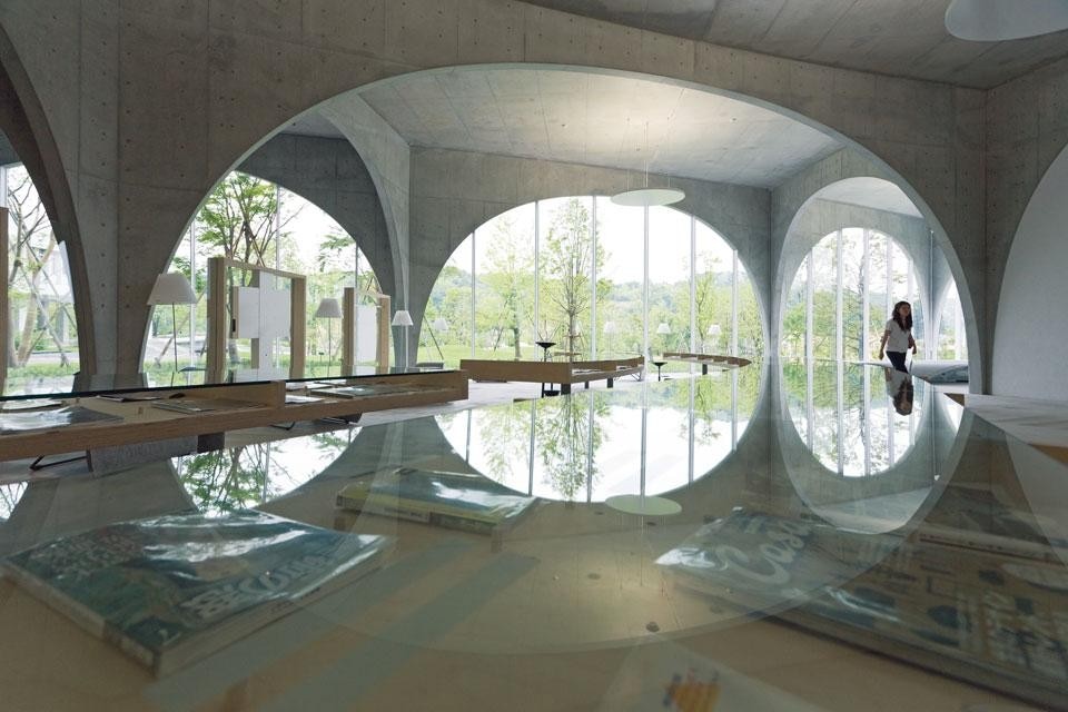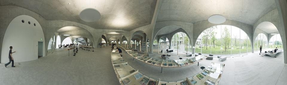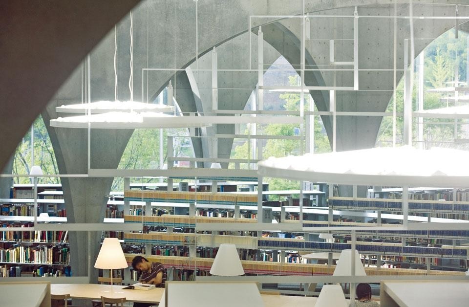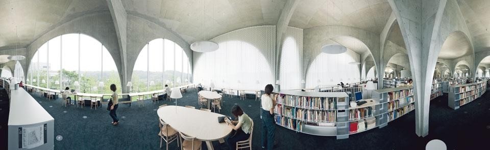 Per permettere a questo flusso di persone di penetrare liberamente nell'edificio e di essere visibile dall'esterno, abbiamo immaginato una struttura composta da arcate posizionate in modo discontinuo; sembra così che il piano inclinato e il giardino frontale proseguano anche all'interno della biblioteca. Questi archi, così atipici, sono stati costruiti con delle lastre di acciaio rivestite di cemento; sono disposti lungo delle linee curve che si incrociano tra loro in diversi punti. Grazie a queste intersezioni, siamo riusciti a rendere le arcate molto snelle alla base, ma perfettamente in grado di sostenere il pesante carico del piano sovrastante.