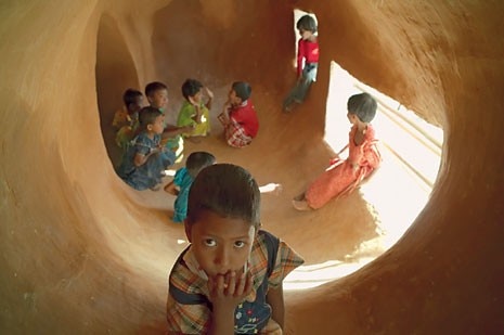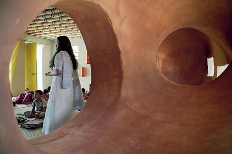 I muri del piano terra sono portanti, fatti da un miscuglio di argilla e paglia, lavorato con l'aiuto di buoi e bufali d'acqua, e gettato in una progressione verticale di strati, ciascuno dei quali ha richiesto una settimana per l'essicazione. Oltre alla terra è il bambù – leggero, resistente, solare – a connotare tanto la struttura quanto gli spazi della scuola. La gioiosità e ariosità delle grandi aule, in cui riverberano i colori vivaci delle tende e dei teli disposti sotto al soffitto, rispondono ai principi educativi di METI, che promuove un metodo di apprendimento libero, teso a valorizzare le capacità individuali, gli interessi e i ritmi personali dei bambini.