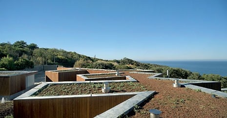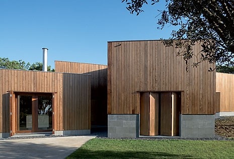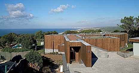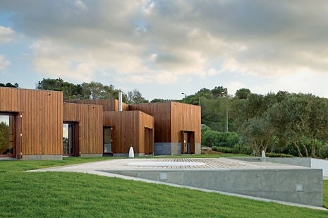 Alle unità indipendenti si accede in modo discreto attraverso un percorso tortuoso, come fossero megaron autonomi: riflessi prismatici, per così dire, di un villaggio di pescatori appartenente a una qualche epoca pre-consumistica. Un altro prisma – lo studio accanto all'ingresso – completa lo schema ad ali divaricate, insieme a un cortile d'accesso dalla forma irregolare e a un garage collocati nella parte più elevata del terreno che, per il resto, degrada impercettibilmente verso il mare. La relativa inaccessibilità dell'oceano è compensata da una piscina e da un solarium: sapientemente collocati, lasciano la casa paradossalmente circondata da un prato. Una fascia di marciapiedi in cemento e di isolate terrazze in pietra si interpone tra il prato e la casa: come fosse il prolungamento orizzontale della base rivestita in pietra che, con variazioni di profondità, delimita il legno che riveste la casa.