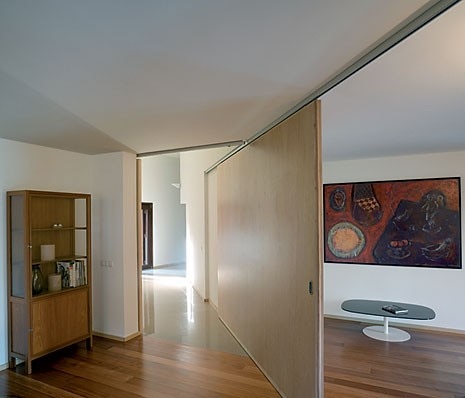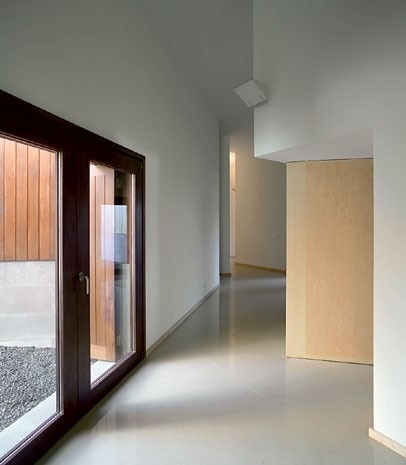 Malgrado il rigore scultoreo del volume, al carattere suburbano dei prospetti, con i loro inserti lignei e delle doppie porte in cristallo pesantemente incorniciate in legno, risponde incisivamente all'interno la superfi cie intonacata di un corridoio tortuoso, misteriosamente illuminato e lastricato in pietra, che immette nello spazio cucina-zona pranzo: per ricordare a una classe arrivista le sue origini contadine.