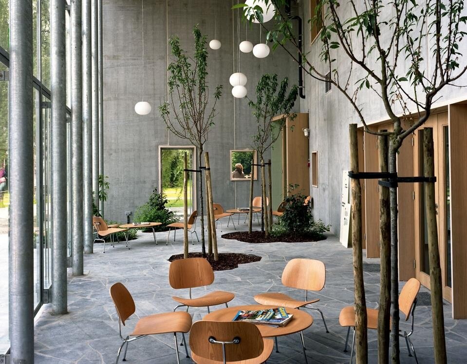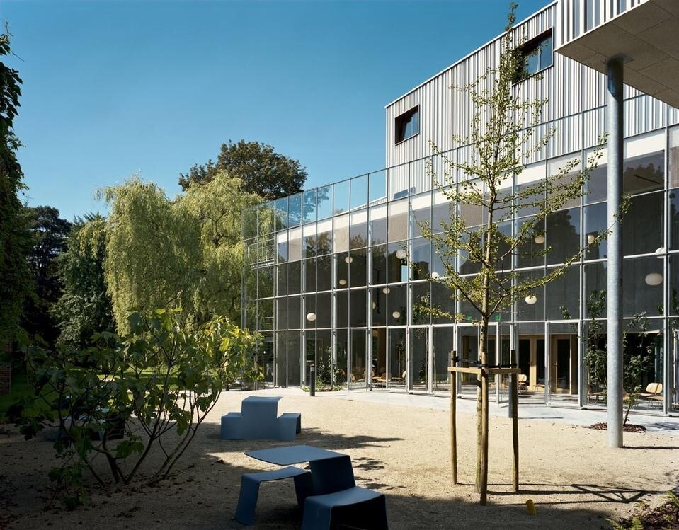 L'accento scenografico impresso all'intervento ha guidato la soluzione architettonica, che affronta in termini molto chiari e decisi il problema dell'interrelazione con il giardino secolare circostante. Il grande sbalzo a C del nuovo edificio – realizzato con una struttura innovativa in pannelli di legno massiccio – non solo si protende con belle proporzioni verso il verde, ma lo richiama verso di sé e lo include. La geometria precisa dei volumi acquista un doppio valore, come costruzione spaziale ben articolata e come interfaccia tra il preesistente e il parco. L'effetto di risonanza con l'intorno è affidato anche all'opera dell'artista Jeanine Cohen estesa ai 900 metri quadri di facciata dell'estensione: dei sottili profilati di alluminio di dimensioni irregolari, montati fittamente in verticale, lasciano intravvedere sullo sfondo una superficie a colori pastello, mutevole sotto l'incidenza della luce naturale. Oltre a conferire leggerezza alla struttura, questo involucro vibrante dialoga con il tema dell'istituzione – che ospita una collezione di 80.000 fotografie e tre milioni di negativi – conferendo all'edificio una condizione di 'fotocomposizione' permanente.