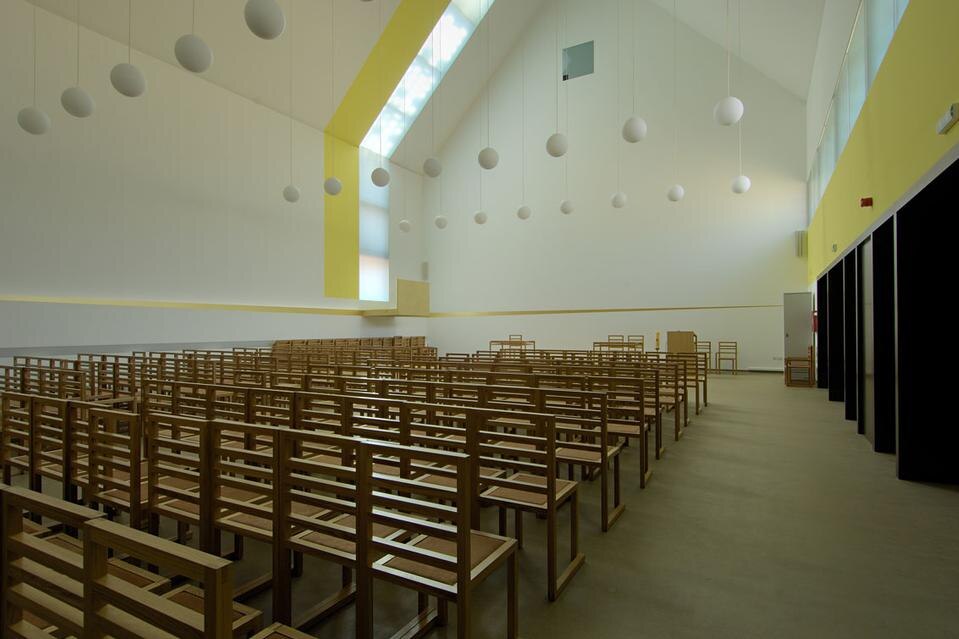 Internamente la sala traduce in forma concreta la semplicità e l'ascetismo dell'ordine francescano. È un volume imbiancato che segue i contorni dell'involucro esterno, inequivocabilmente semplice e allo stesso tempo, come l'esterno, pieno di ingegnose e inaspettate sorprese. Più si guarda, più cose si vedono: per esempio, il pulpito giallo oro che è e non è un pulpito; la banda di colore giallo, che corre all'altezza delle spalle per tutta la stanza, definendo il confine tra base e sovrastruttura, aggiunge alla lettura visiva dei piani murari sovrastanti e sottostanti la dimensione di un gioco percettivo. Le attese sono continuamente tanto soddisfatte quanto confuse. I pannelli di vetro verticali e orizzontali riempiono lo spazio di luce uniforme, ma le loro stesse superfici si screziano del tremolante disegno iridescente di ombra e luce gettato dalle traforature dell'involucro di terracotta. Come nella parte esterna dell'edificio, stasi e animazione sono costantemente in azione.