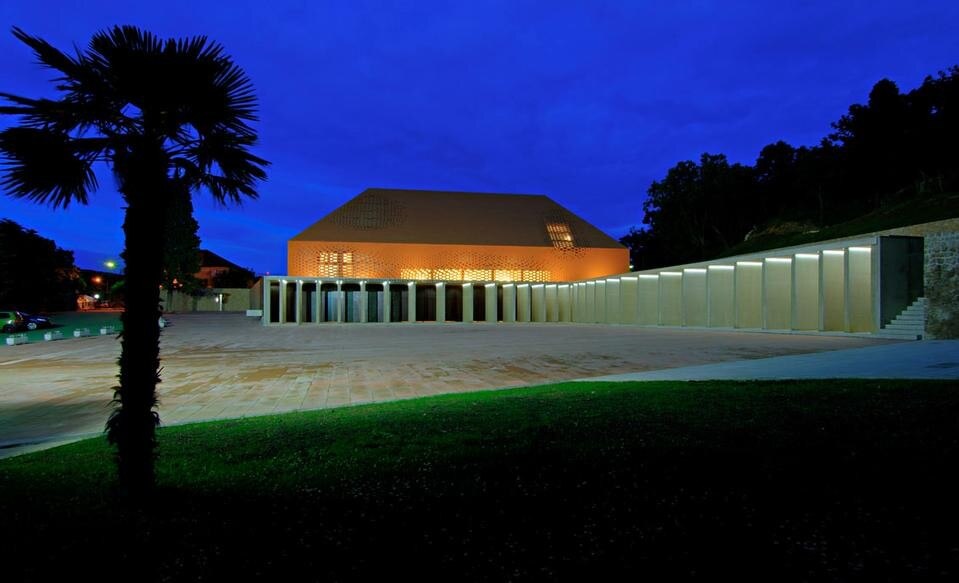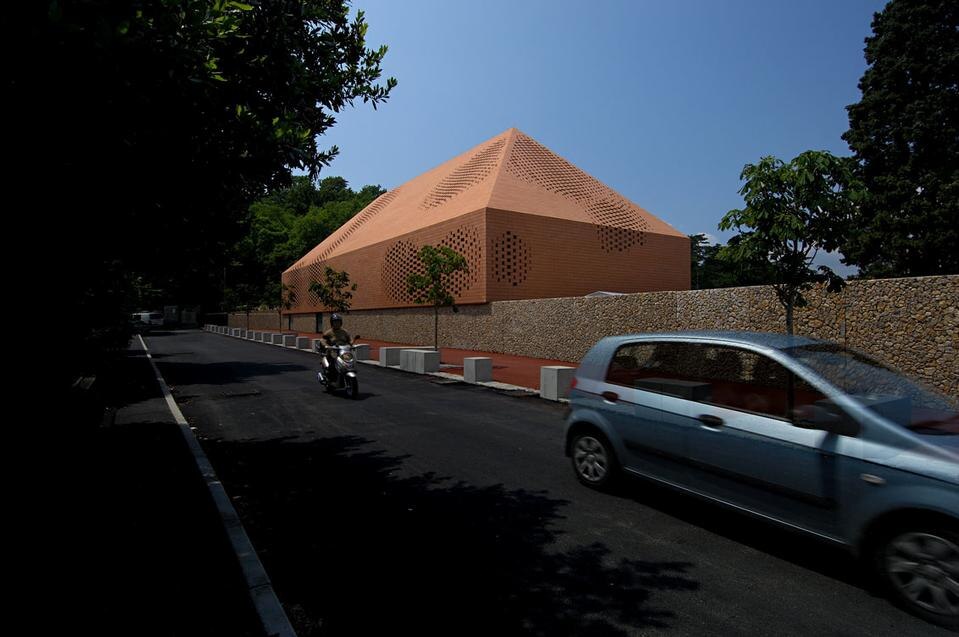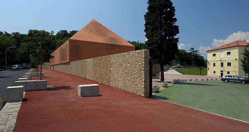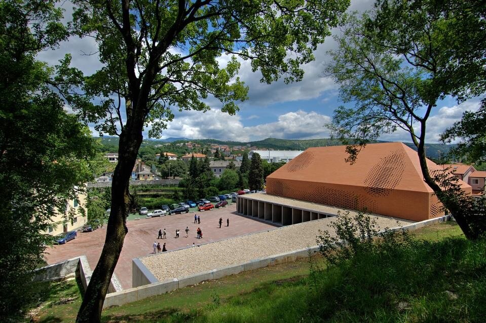 Nella sala di Randic e Turato questi legami si manifestano in tutta la loro portata e rilevanza per l'identità collettiva e le aspirazioni dei croati. L'edificio è per molti versi l'espressione materiale della volontà e del caso all'origine della sua costruzione. Il volume contenuto della sala con il suo tetto a spigolo quasi piramidale, le sue superfici linde e le sue linee pulite è tanto archetipico (una ur-forma) quanto radicalmente contemporaneo. Anzi, fa scontrare l'una contro l'altra queste condizioni contraddittorie. La sua massa è al tempo stesso monumentale e smaterializzata dalla luce che filtra attraverso il "merletto" geometrico del suo rivestimento traforato di terracotta. I disegni traforati- come i pezzi Op Art che il gruppo di Zagrabia New Tndencies creò al computer negli anni Sessanta - creano una tensione visiva dinamica sulla superficie stessa. Alla sguardo le traforature sembrano quasi create da forze invisibili che, alternativamente, tirano, rilasciano e tendono le linde superfici del leggero volume di terracotta. L'animazione della superficie- che è in realtà di gran lunga più profonda e strutturale di qualsiasi animazione generabile al computer- genera una tensione tra la forma stabile e simmetrica e i disegni estremamente instabili che percorrono i suoi piani. È possibile leggere questo gioco di opposti e questa trasmutazione come il correlativo architettonico della condizione incerta, transitoria e colma di contraddizioni della Croazia contemporanea, un paese vicinissimo, e pronto, a entrare nell'Unione europea. È una condizione nella quale un numero incalcolabile di forze spingono il paese in una moltitudine di direzioni diverse e nella quale la stabilità sembra sempre essere accompagnata dal suo contrario. Questa condizione è potentemente evocata anche dalla posizione della sala di terracotta, che è appoggiata in maniera leggermente storta sul basamento di calcestruzzo- una condizione chiaramente visibile dal punto di vista soprelevato del sentiero percorso dai pellegrini che si avvicinano al sito dalla collina di Tersatto.