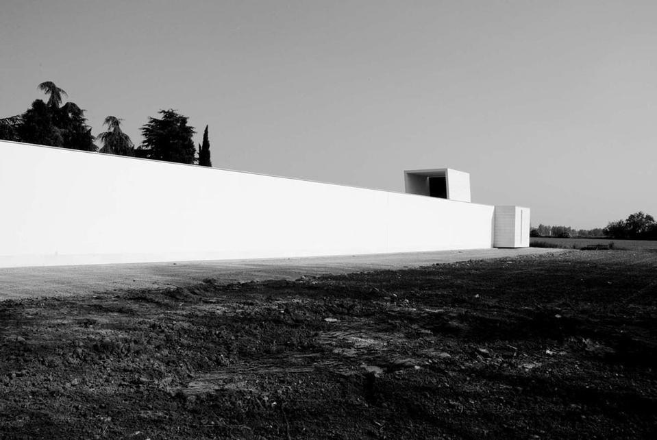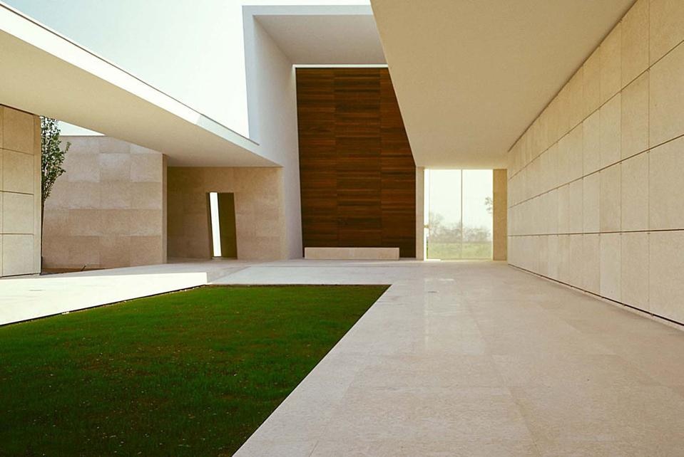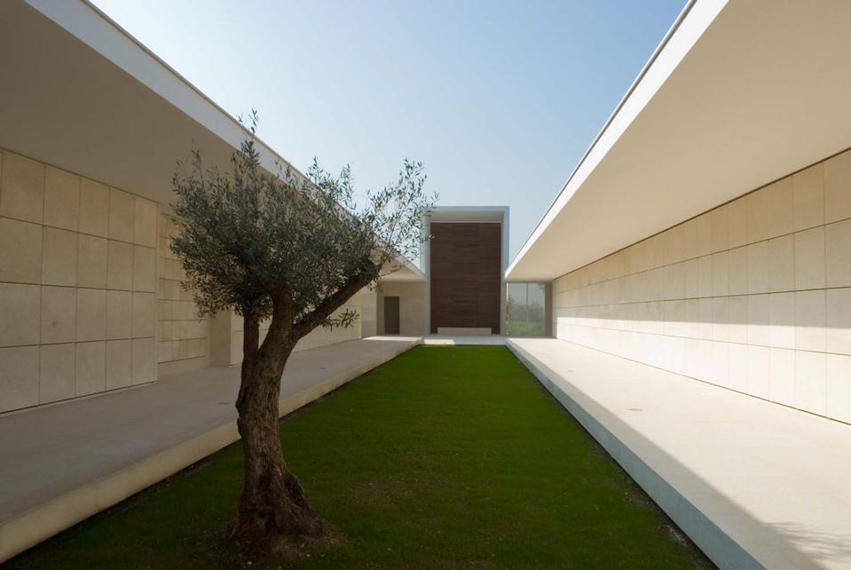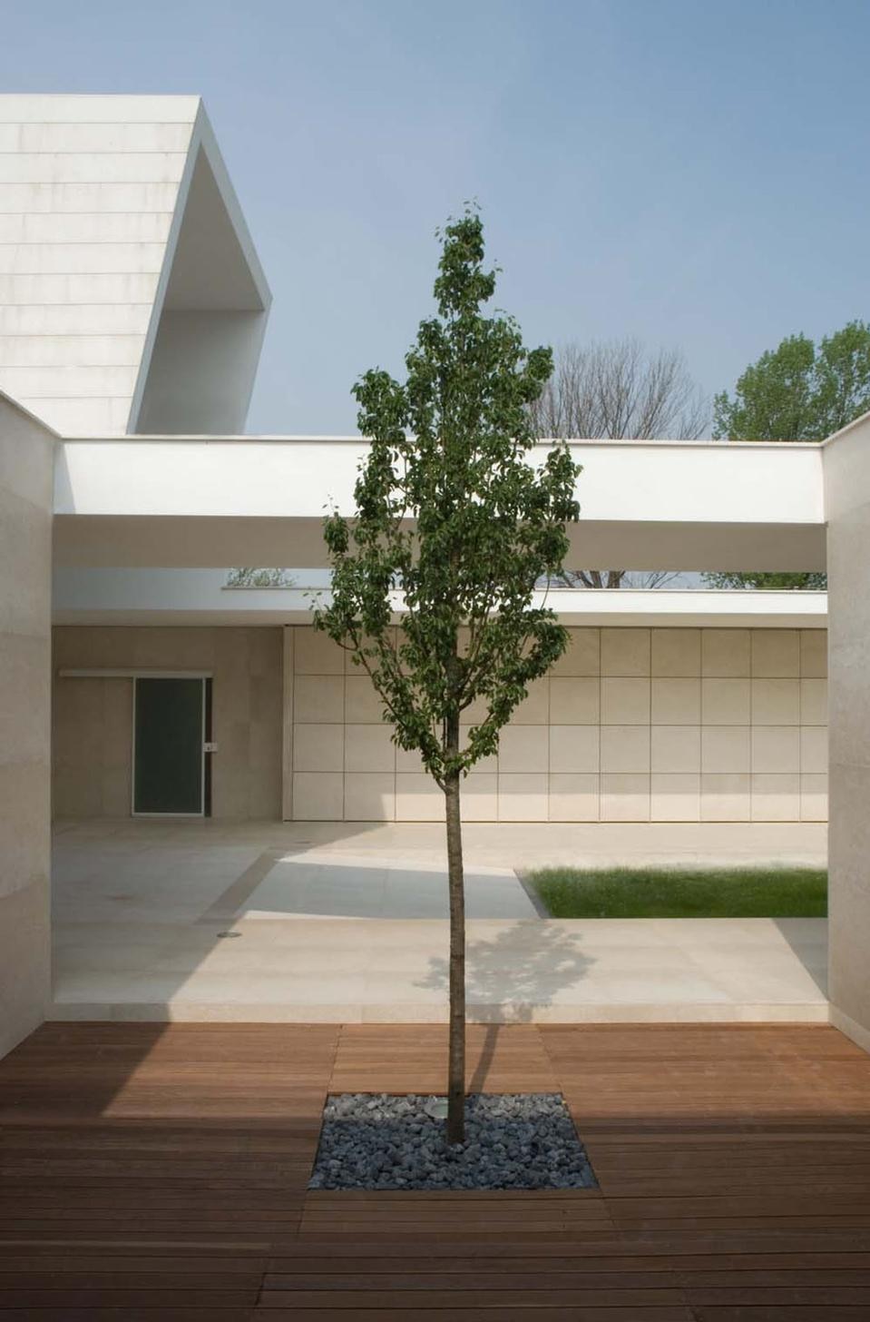 Lo spazio della corte è formato da un portico con una copertura a sbalzo di tre metri e da un piano di calpestio leggermente rialzato: questi elementi definiscono il perimetro della corte, disegnano il giardino e misurano il cielo.