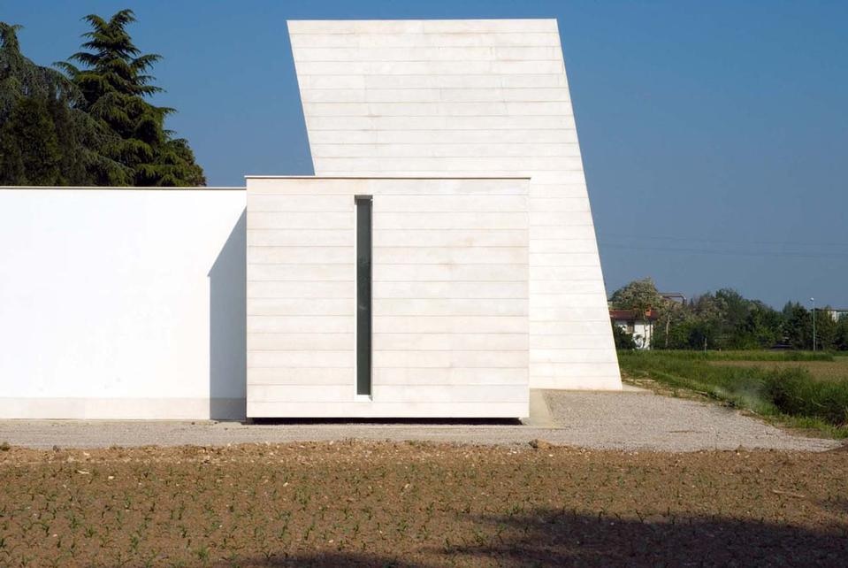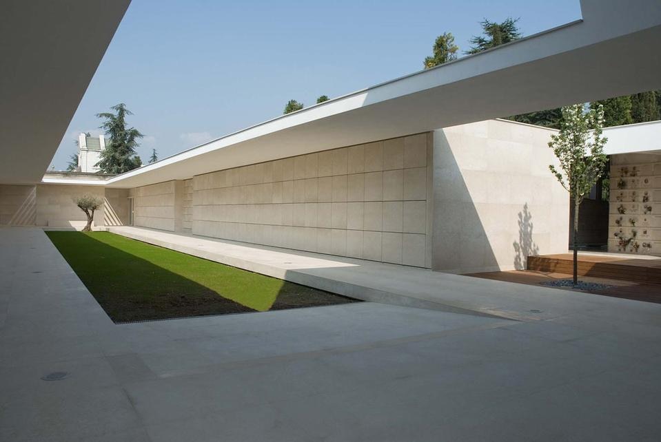 I materiali e i colori sono ridotti ai minimi termini: il verde del prato, i pavimenti e le pareti dei loculi in marmo botticino, il legno di Ipè per la grande loggia e la corte-soglia, l'intonaco per i solai a sbalzo. Con la presenza enigmatica di due alberi: un grande ulivo nella corte grande, un pesco in quella foderata di legno.