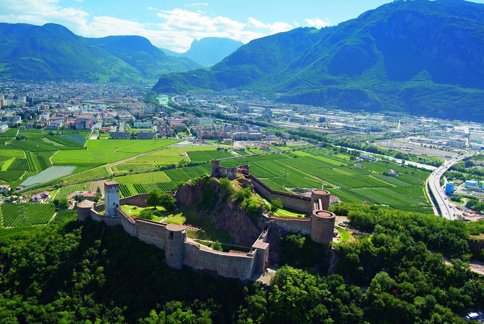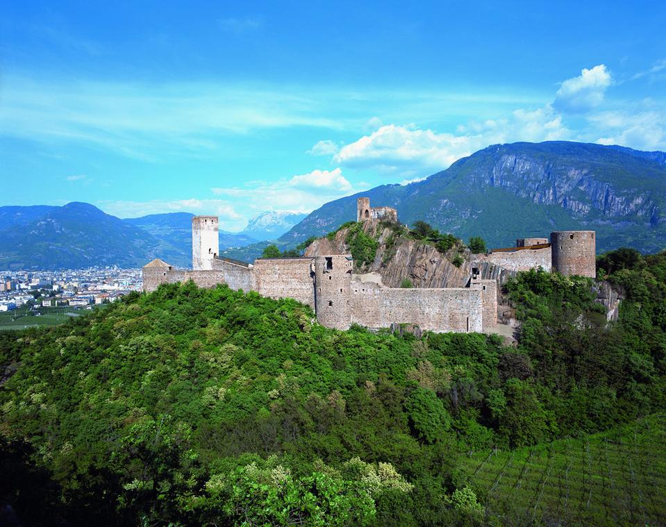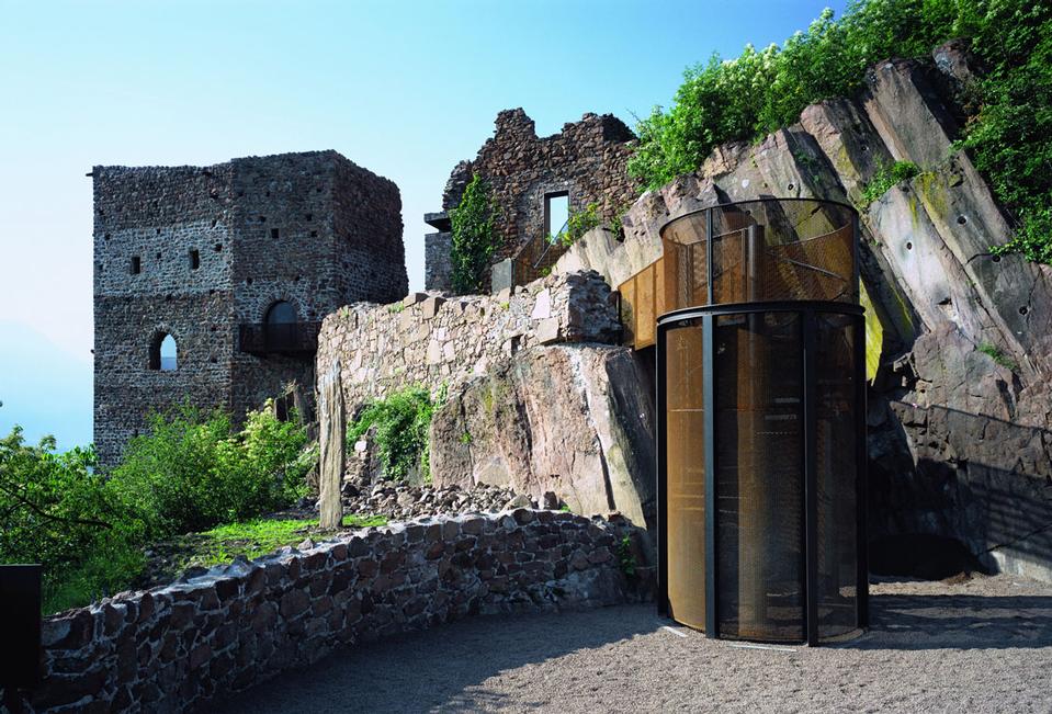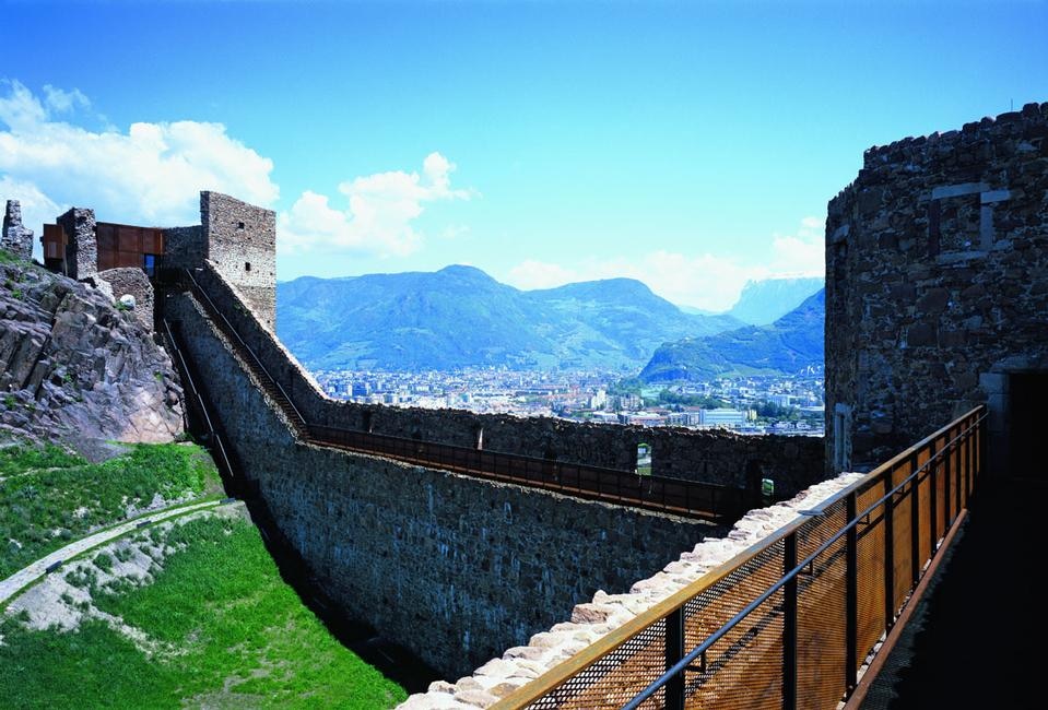 Accanto al portone d'ingresso al castello, vi sono un nuovo edificio per lo shop del museo, gli impianti tecnici e l'appartamento del custode. Nell'attiguo corpo di fabbrica, a ponente, è stato nuovamente previsto un ristorante. La costruzione ha recuperato la forma originaria del tetto a una falda, appoggiata al muro perimetrale, potendo ricavare così nel sottotetto un ampio ambiente per le esposizioni temporanee. Nella cosiddetta Torre Bianca è stata inserita una struttura in acciaio sospesa alle travi del tetto, con l'illustrazione su più livelli delle vicende storiche di Castel Firmiano. Il percorso del Museo della montagna inizia nel torrione settentrionale e conduce, attraverso il cortile settentrionale e il teatro di roccia, al palazzo a quattro piani, integrato nel muro perimetrale orientale. Sopra di esso, troneggia su un rilievo roccioso l'inaccessibile e più antico nucleo della roccaforte, con i resti di una cappella romanica. Sui pesanti blocchi di porfido del muro perimetrale orientale corre un camminamento di ronda in acciaio rosso ruggine, che dispiega da un'altezza aerea la vista sulla conca della vallata e sui monti circostanti. Una rete trasparente in lamiera stirata che, se vista da lontano sembra dissolversi contro il blu del cielo, appoggia e sostiene il visitatore.