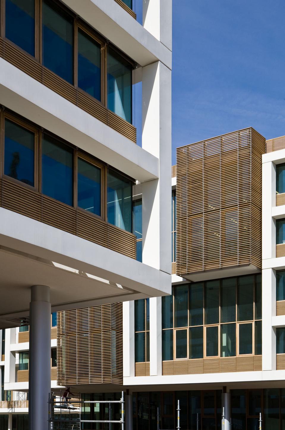 Iconicità: una facciata continua all'esterno, come a dare protezione dalla "ruvidezza" dell'ambiente urbano circostante, collega gli edifici in una striscia piana di solidi e di spazi, Ciò dà luogo a una rete bianca a maglie ortogonali, fuori scala rispetto alle altezze tra i vari livelli, che avvolge e inghiotte la trasparenza del vetro e il legno delle strutture: un oggetto indipendente che dà vita alla nuova dimensione urbana alla quale l'edificio viene percepito.