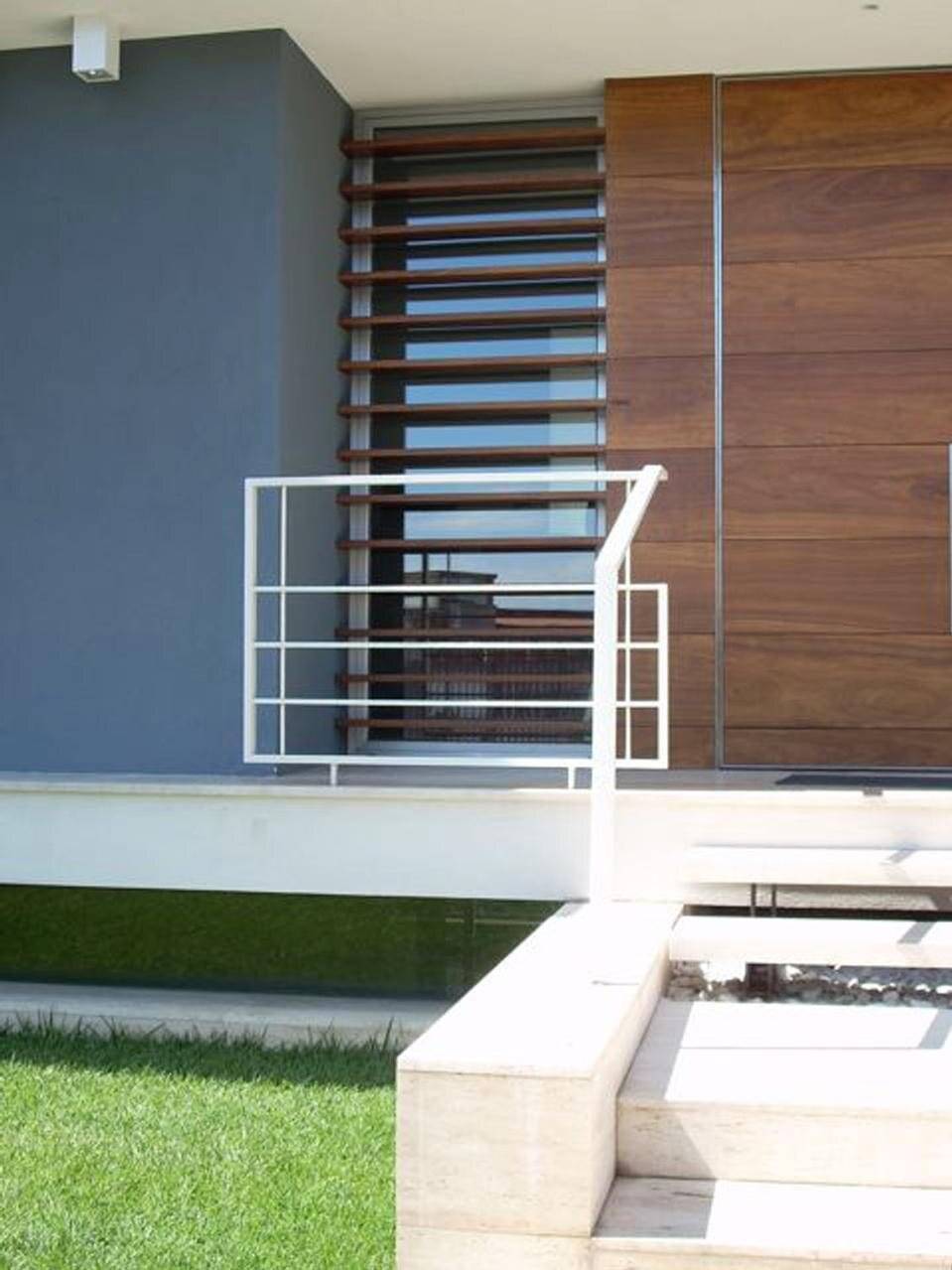 Sul "cortile chiuso" si affaccia il corridoio (pastas) del primo piano che costituisce l'asse distributivo e strutturale, la regola d'ordine planimetrica rispetto alla quale sono stati organizzati tutti gli ambienti della casa. La casa, che i vincoli del masterplan hanno "costretto" in un volume che lascia liberi solo due fronti (a Sud e a Nord), si sviluppa su tre livelli differenziati per tipologia distributiva e funzionale (servizi per la residenza, Zona giorno e zona notte). In particolare al piano terreno si trovano gli ambienti di soggiorno che, con ampie bucature, si relazionano al giardino interno, concepito come "hortus conclusus". Tale relazione è negata sul fronte sulla strada, che è un fronte "chiuso" concepito come fondale del giardino ornamentale. La "chiusura" è denunciata da una prevalenza dei pieni sui vuoti e da schermature/bucature che lasciano intravedere dall'interno il paesaggio circostante e dall'esterno non svelano l'organizzazione spaziale interna. I materiali impiegati nella costruzione e nella definizione architettonica e cromatica degli esterni e degli interni sono quelli della tradizione locale: intonaco bianco e grigio scuro (tipico della zona) per i prospetti; travertino rigato e levigato (scelto sia per durabilità sia per il cromatismo simile alla pietra di Modica molto impiegata nell'area del catanese) utilizzato nei prospetti come rivestimento e, soprattutto, nelle pavimentazioni interne ed esterne della zona giorno, fino al giardino; la pietra lavica, impiegata per le pavimentazioni a diretto contatto con il suolo (pavimentazioni esterne e del piano seminterrato), quasi simbolicamente a ribadire la tettonica del luogo.
