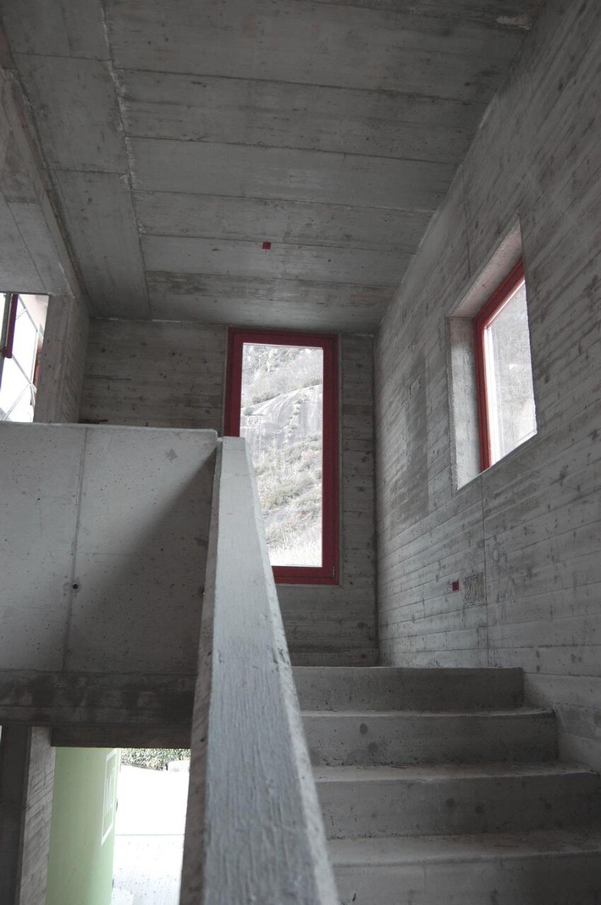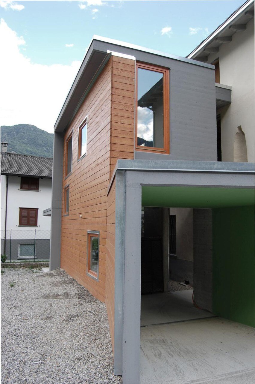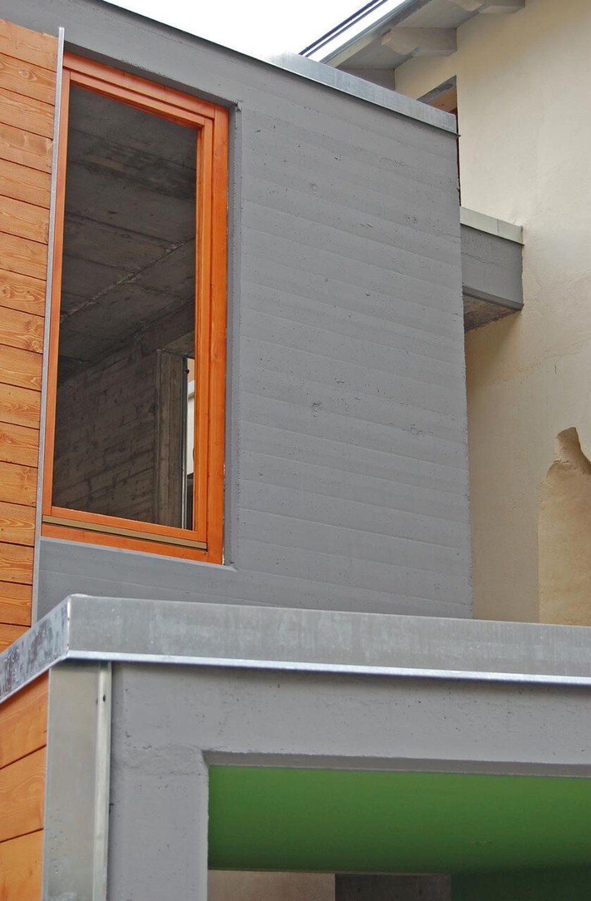 La struttura in cemento armato a vista è motivo formale e funzionale: formale poiché, abbracciando tutte e tre le funzioni, agisce da elemento aggregante tra le stesse, e funzionale poiché di fatto regge tutta la struttura. In cemento sono le pareti dei bagni, così come la soletta di copertura del porticato e i pilastri a sezione tonda, come pure le pareti del blocco scale. La parete che prospetta sul cortile interno destinato a parcheggio è rivestita in listoni di larice. Questa parete è poi forata con alcuni serramenti in legno che portano luce all'interno del corpo scale e contribuiscono ad alleggerire la facciata. L'ingresso al corpo scale è evidenziato da una estroflessione delle pareti che offre una sensazione di protezione e invito. Enrico Scaramellini, Guido De Novellis