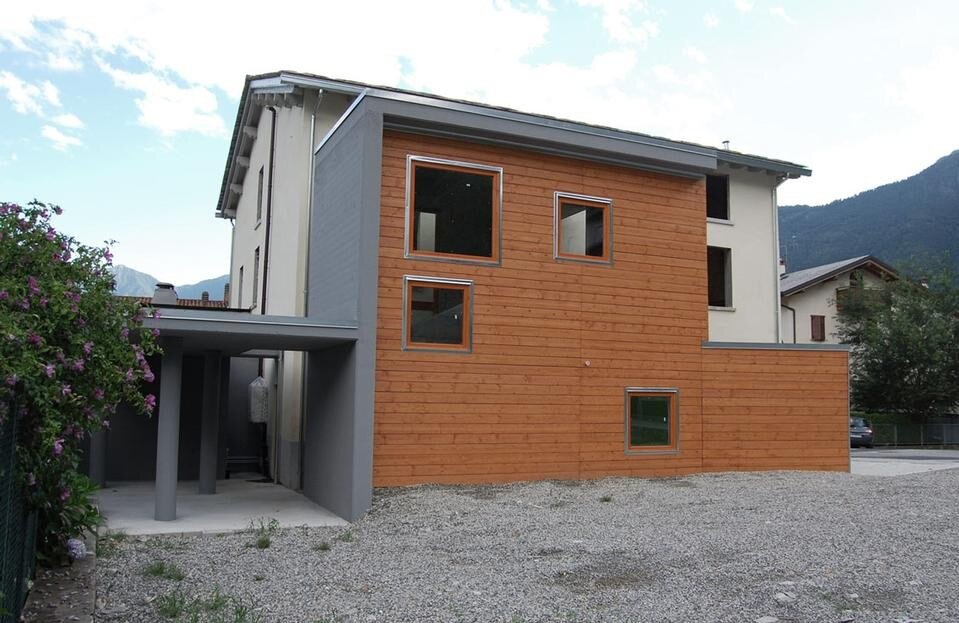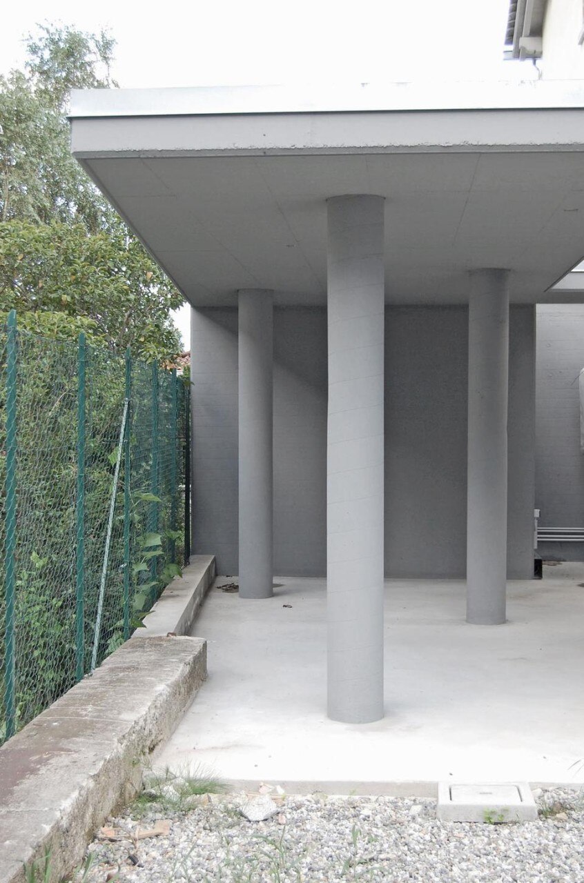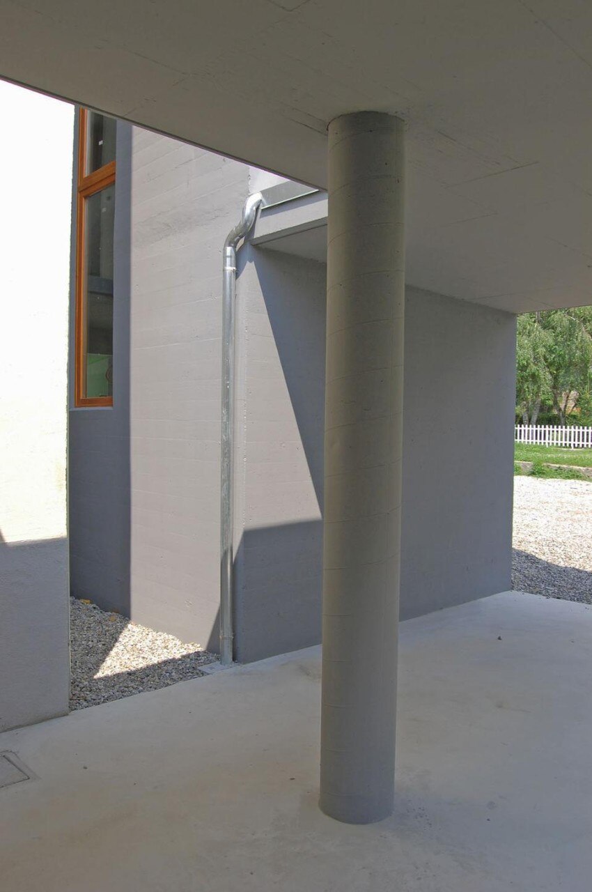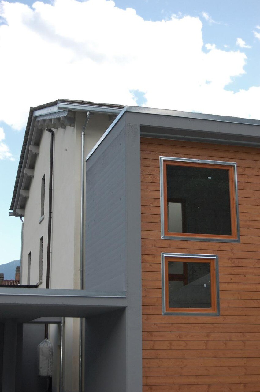 La struttura in cemento armato a vista è motivo formale e funzionale: formale poiché, abbracciando tutte e tre le funzioni, agisce da elemento aggregante tra le stesse, e funzionale poiché di fatto regge tutta la struttura. In cemento sono le pareti dei bagni, così come la soletta di copertura del porticato e i pilastri a sezione tonda, come pure le pareti del blocco scale. La parete che prospetta sul cortile interno destinato a parcheggio è rivestita in listoni di larice. Questa parete è poi forata con alcuni serramenti in legno che portano luce all'interno del corpo scale e contribuiscono ad alleggerire la facciata. L'ingresso al corpo scale è evidenziato da una estroflessione delle pareti che offre una sensazione di protezione e invito. Enrico Scaramellini, Guido De Novellis