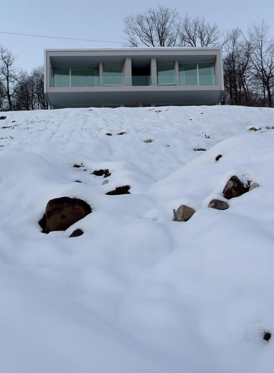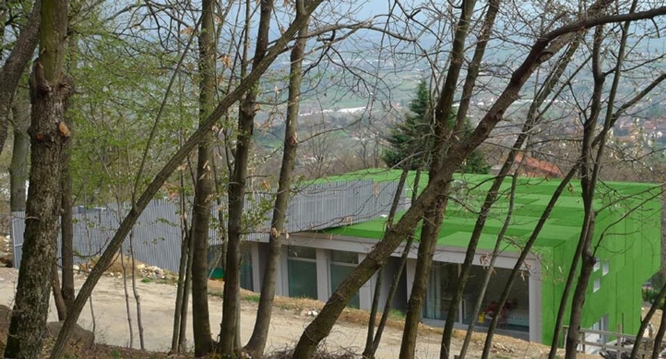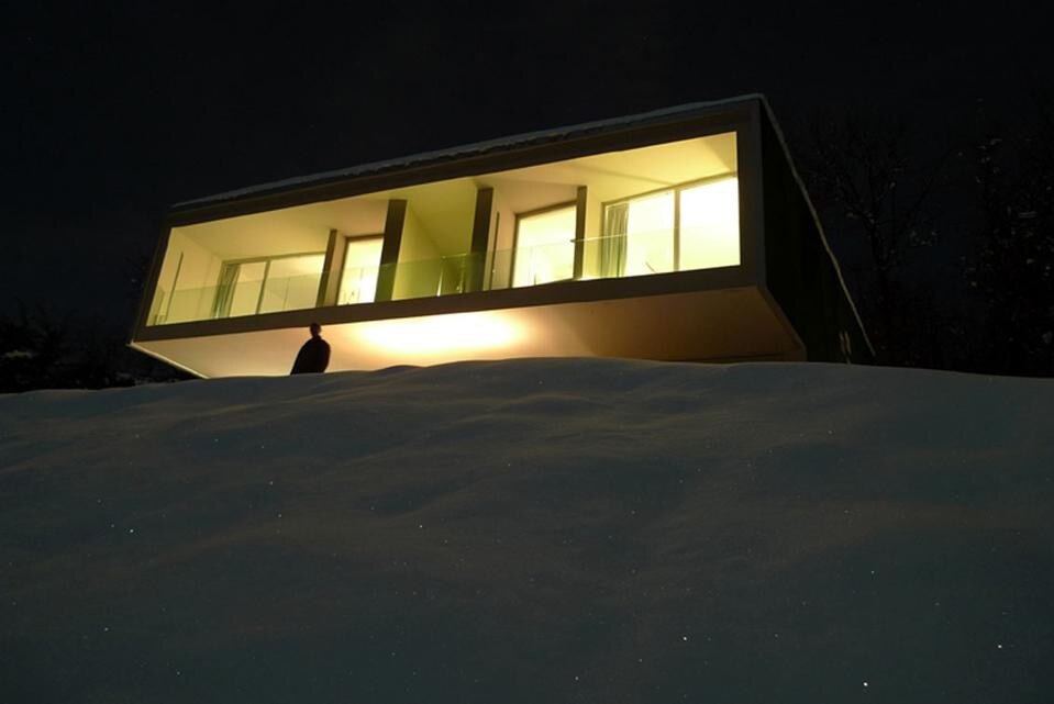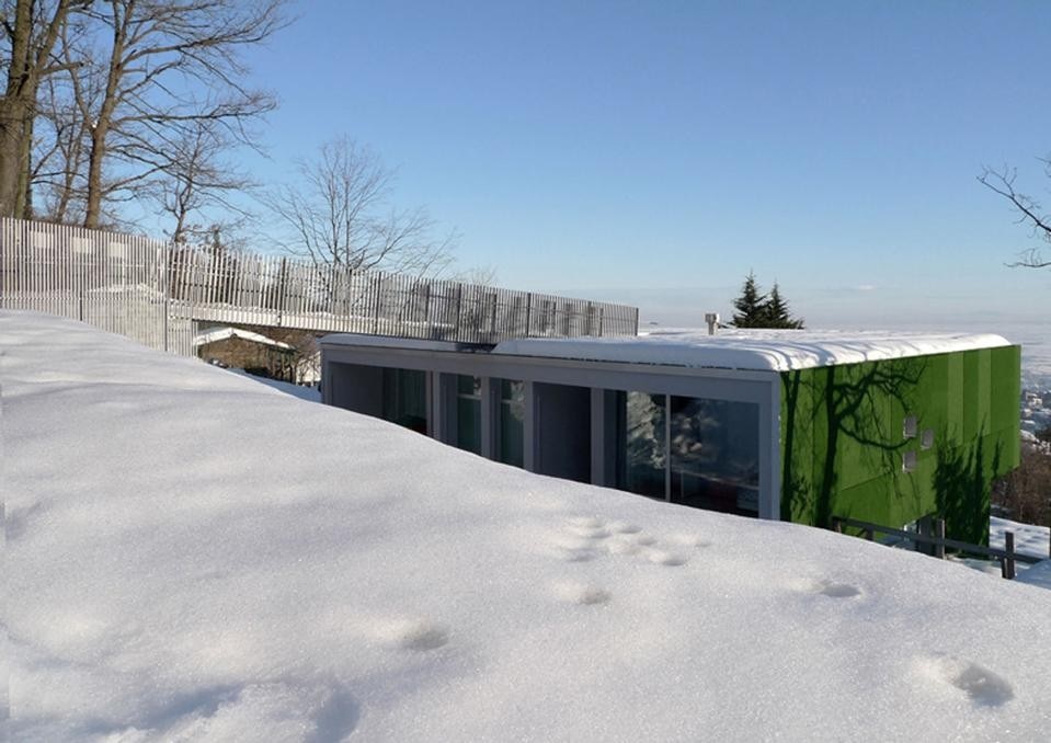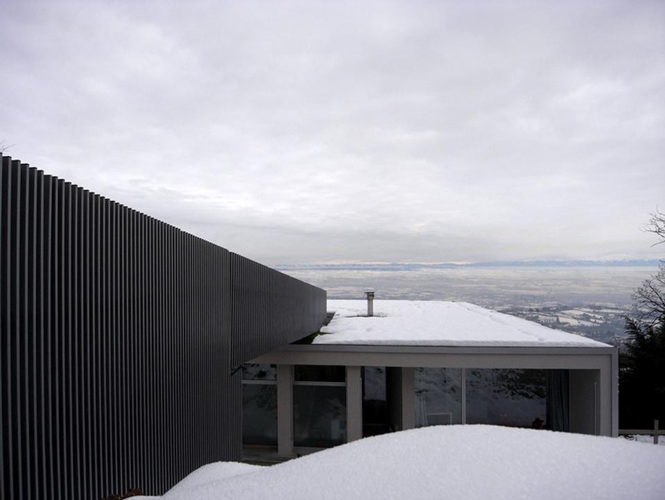 Si è così sviluppata l'idea di un'architettura mimetica, percepibile attraverso angoli visuali profondamente diversi. L'artificialità della nuova costruzione si esprime in forma mimetica e l'approccio dall'esterno è caratterizzato dall'accesso alla casa dall'alto: il tetto piano diviene l'unico elemento percepibile dalla strada e, con la sua linea, ridefinisce il paesaggio sottostante.