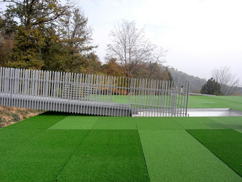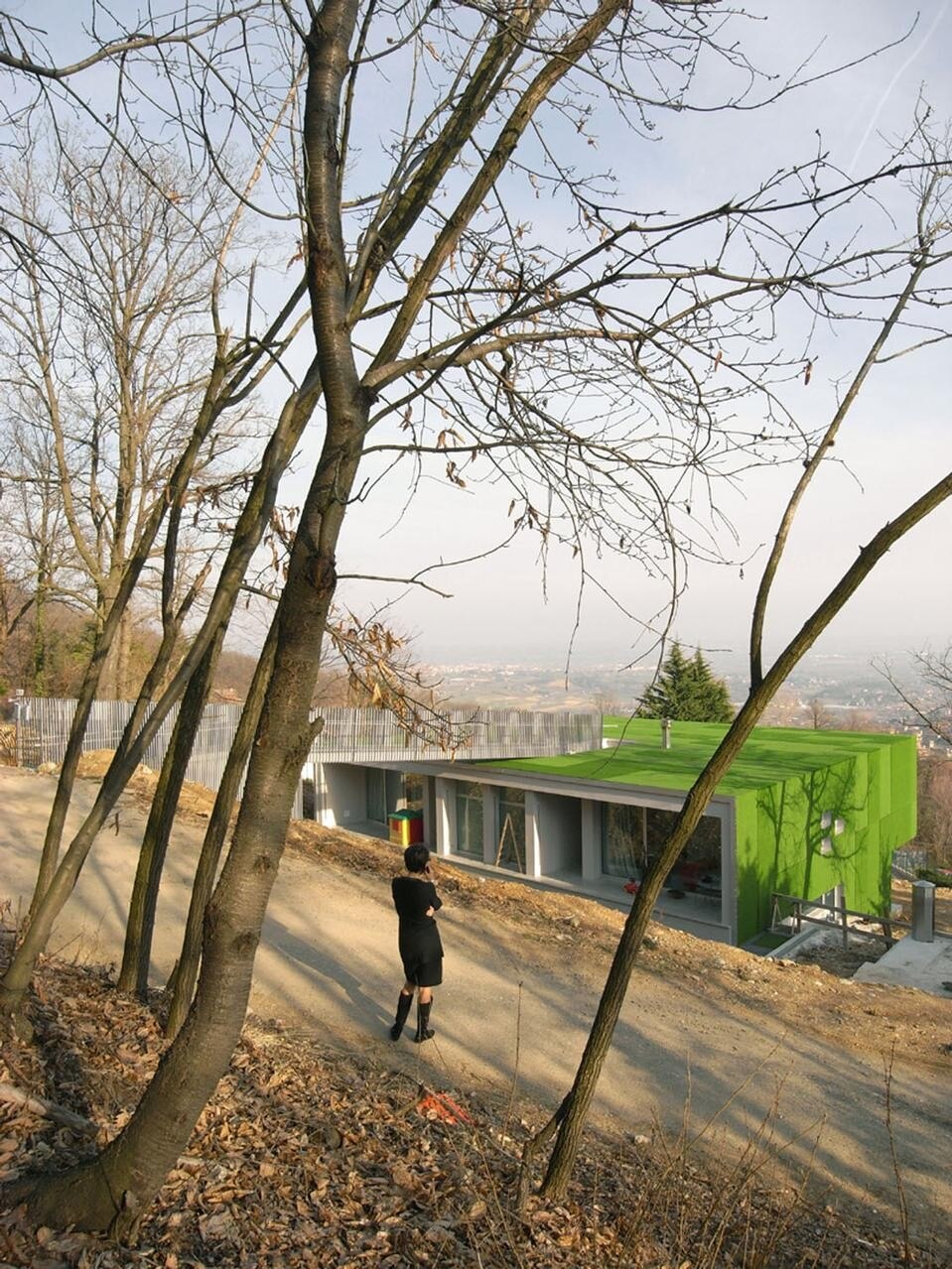 Questa geometria che sembra volersi imporre sulla realtà viene, invece, contaminata e assume su di sé, sulla propria pelle, caratteri di incertezza e mutevolezza. Il rivestimento esterno dell'edificio – un manto di erba sintetica – è, al tempo stesso, una trama astratta e familiare: un'invenzione dell'uomo che ha trasformato la natura del paesaggio. All'interno, gli spazi si dispongono e si organizzano secondo il rapporto tra gli utenti e l'ambiente immediatamente circostante; tra la casa ed il terreno in cui è inserita.