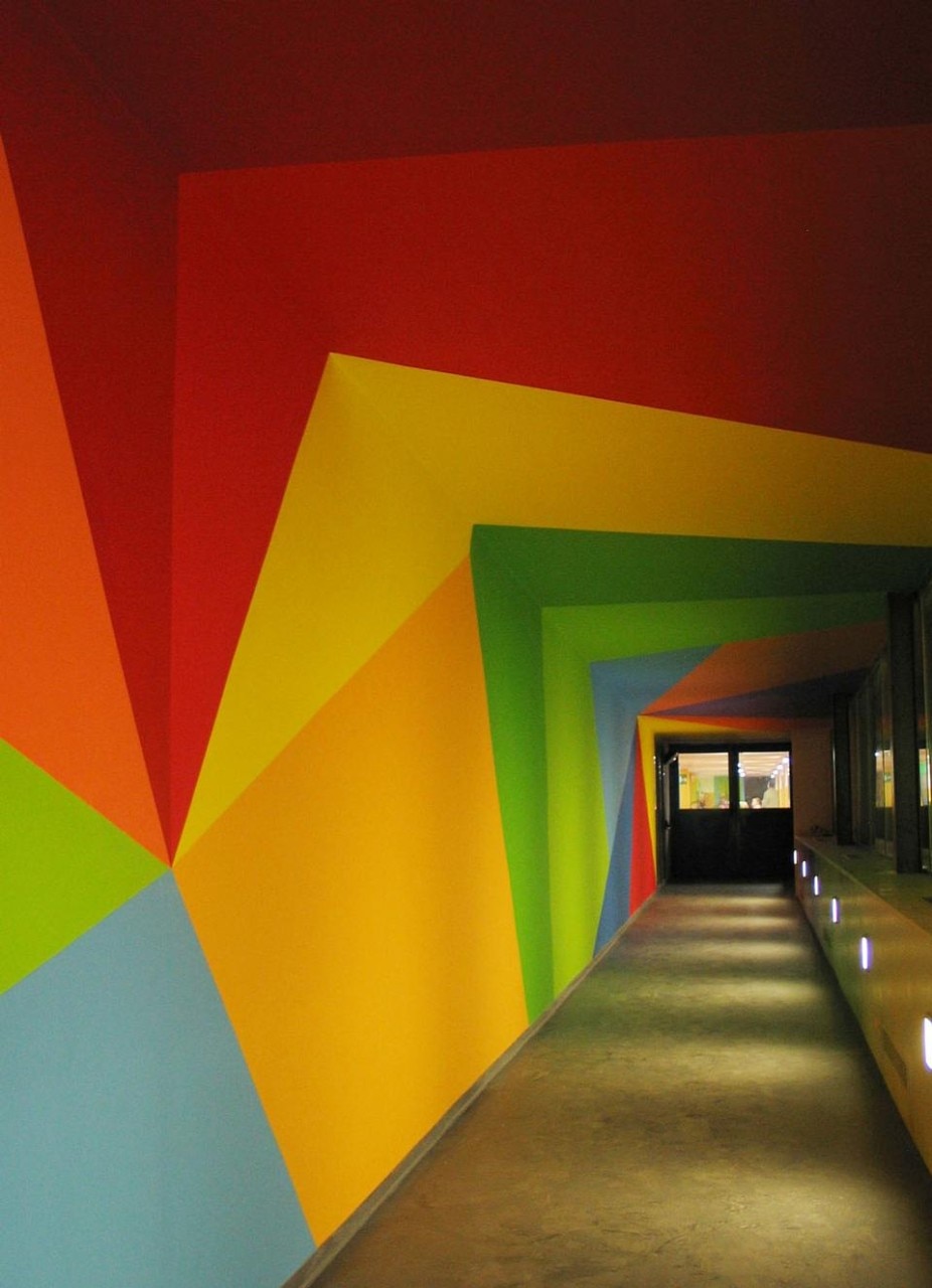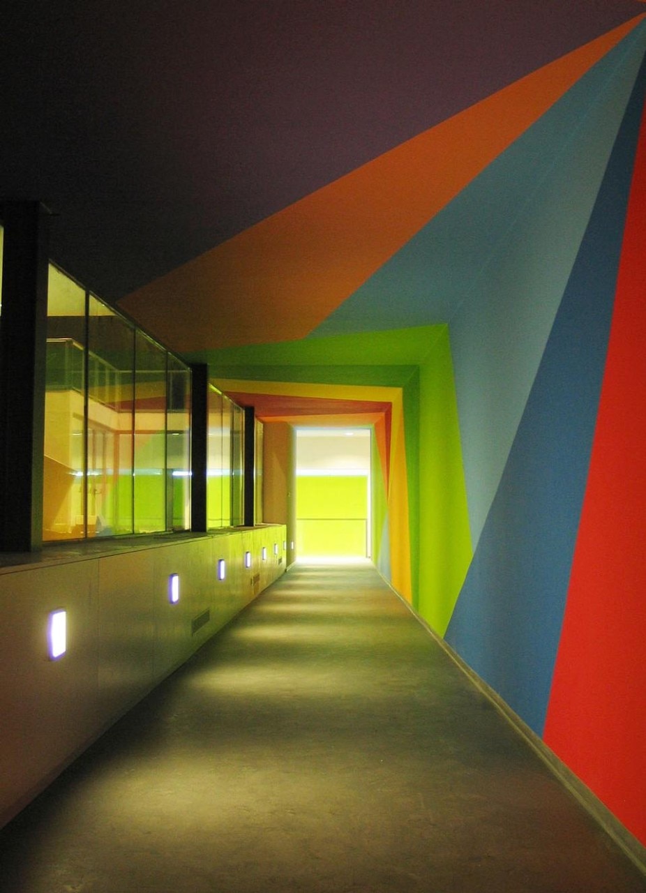 L'utilizzo di una palette multicolore dalle tonalità pure ravviva l'ambiente e carica emotivamente lo spazio. I toni utilizzati nella galleria sono ripresi negli altri ambienti, con un criterio che tende a scomporre i volumi dei locali per piani o angoli di colore: giallo e blu nella palestra, arancio nella mensa, azzurro chiaro nello spazio polifunzionale.