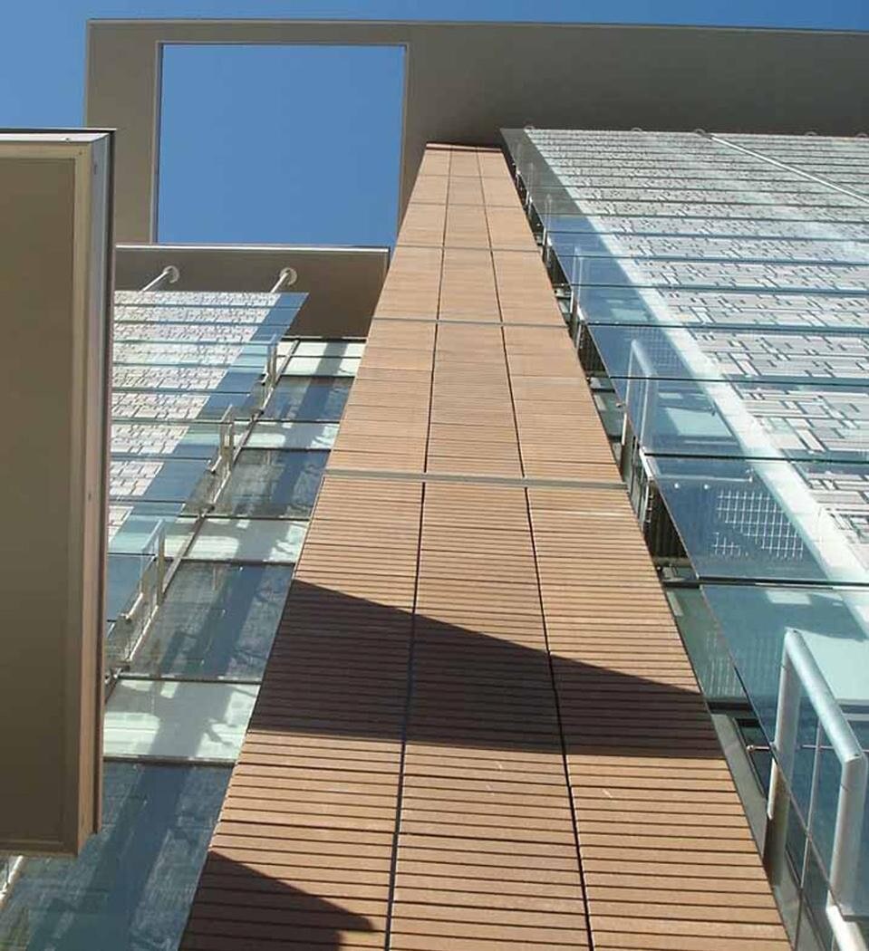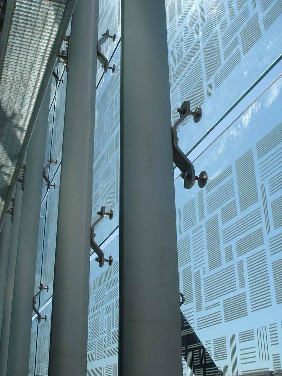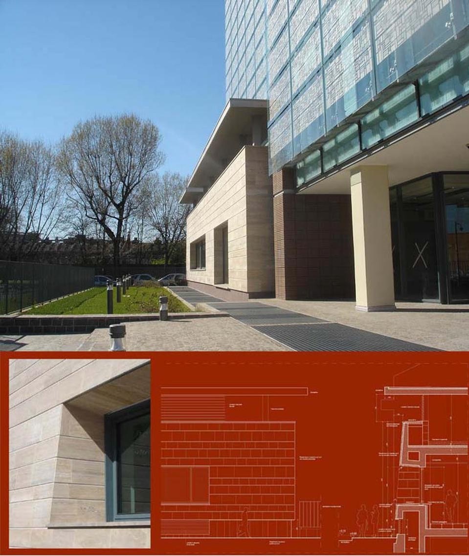 La doppia pelle è una sorta di tenda in lastre di vetro temperato di 12mm appese agli sporti della copertura tramite dei montanti in alluminio con sistemi di fissaggio a routulles. Al suolo il progetto ha previsto una serie di percorsi pedonali che raccordassero le quote e organizzassero gli importanti flussi pedonali generati dai mezzi pubblici e indirizzati da e verso il vicino IULM. Elisabetta e Francesco Latis