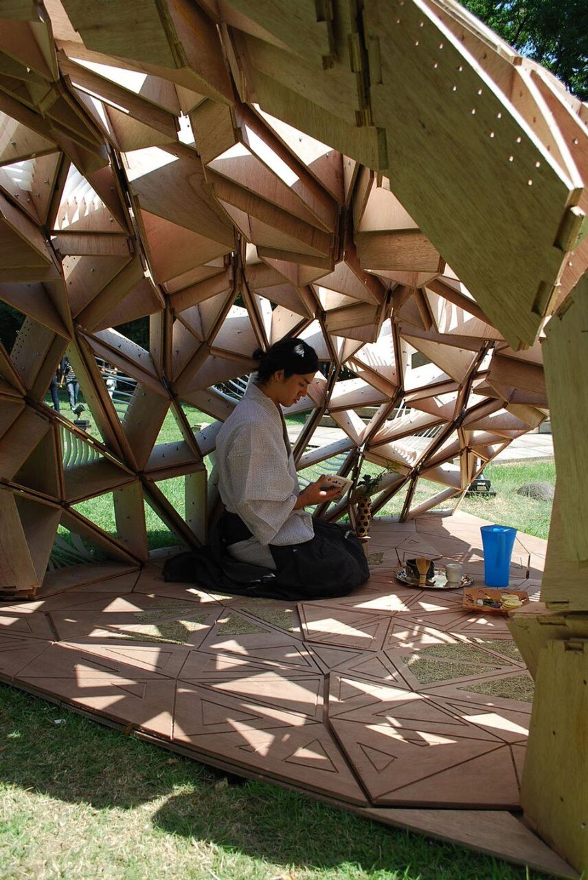 3. Gli studenti della Columbia University hanno usato il design parametrico come pretesto per tradurre gli elementi della cerimonia del tè in progetto. Hanno dato vita a una sequenza spaziale che sfrutta le rispettive entrate e i posti assegnati al maestro di cerimonia e ai due ospiti come "punti focali e attrattori" che, modulati tramite Grasshopper, danno forma alla casa del tè da loro ideata. Nonostante la difficoltà di coniugare l'uso di una geometria spinta con la limitata disponibilità di materiale, il tutto è stato controllato e risolto attraverso aggiustamenti possibili solo grazie all'uso di un software parametrico.