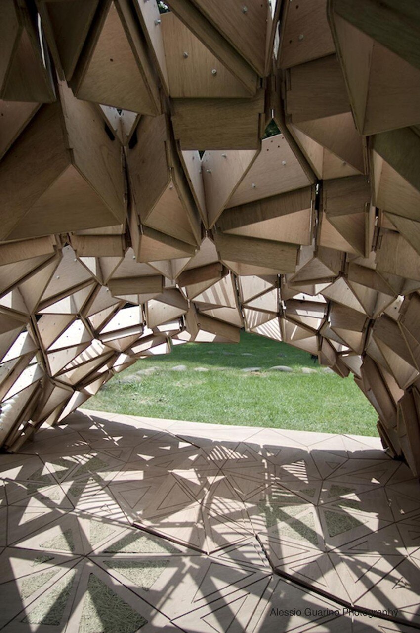 2. Il secondo team, denominato "Space of Waves", ha portato all'estremo le qualità costruttive del compensato, flettendolo al massimo per ottenere un effetto di curvatura che si ispira alle forme imperfette della tazza da tè giapponese. Il padiglione di forma cilindrica – come la tazza – viene smaterializzato, ed è composto da 'onde' inclinate di compensato che, grazie a incisioni praticate con la macchina a controllo numerico, formano lo spazio del padiglione.