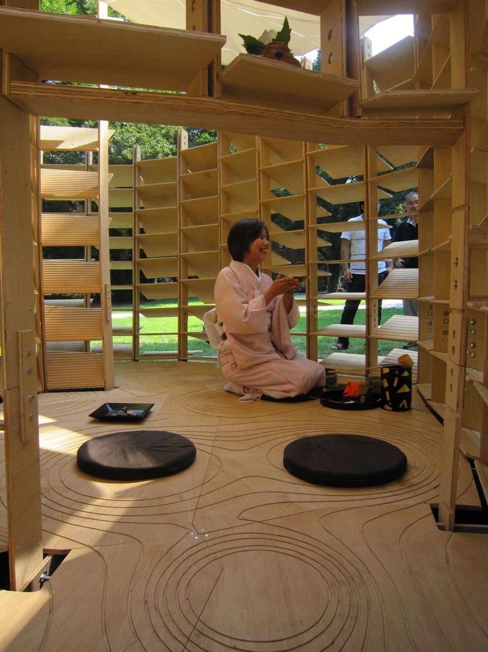 1. Il padiglione '130008252010' è stato progettato per svolgere la sua funzione limitatamente a una certa ora prestabilita: le 13:00 del 25 agosto 2010. La luce del sole che filtra attraverso il tetto composto da una decisa ma delicata composizione triangolare, ricade su un pattern analogo disegnato sul pavimento. La sovrapposizione fra luce e pattern sul pavimento dura solo per un lungo momento, è delicatissima e richiama la piattaforma della villa imperiale di Katsura, costruita per guardare la luna piena di agosto soltanto per una notte. I due ospiti, quando la luce si unisce alla terra, possono bere il tè servito dal maestro di cerimonie.