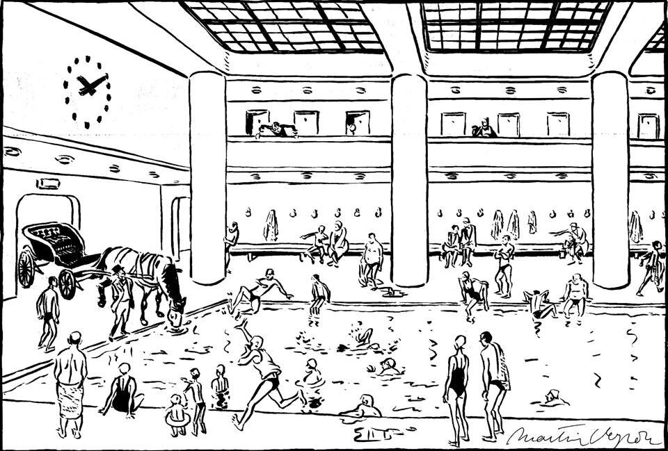 La piscine Lutetia nell’interpretazione dell’illustratore Martin Veyron. Aperta nel 1935, è stata chiusa nel 1970; nel 1978 è stata trasformata in showroom, chiuso nel 1998, ed è diventata monumento nazionale nel 2005 (foto Michel Denancé).