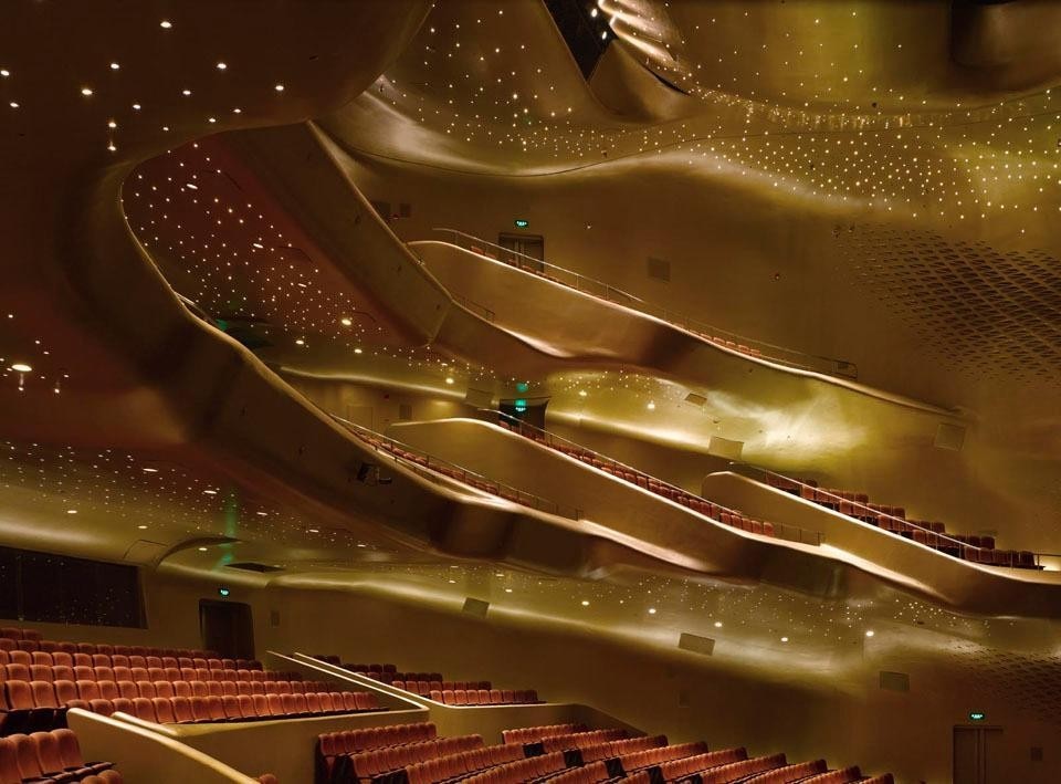 Mentre l'involucro esterno è in certo qual modo muto e pietroso nelle sue sfumature di grigio argenteo, gli interni appartengono decisamente all'altra estremità dello spettro. Le pareti della sala principale sono fragorose fasce dorate punteggiate da luci sparse. I corridoi sono una spettacolare composizione di vetrate a tasselli triangolari e fluttuanti fasce di calcestruzzo.