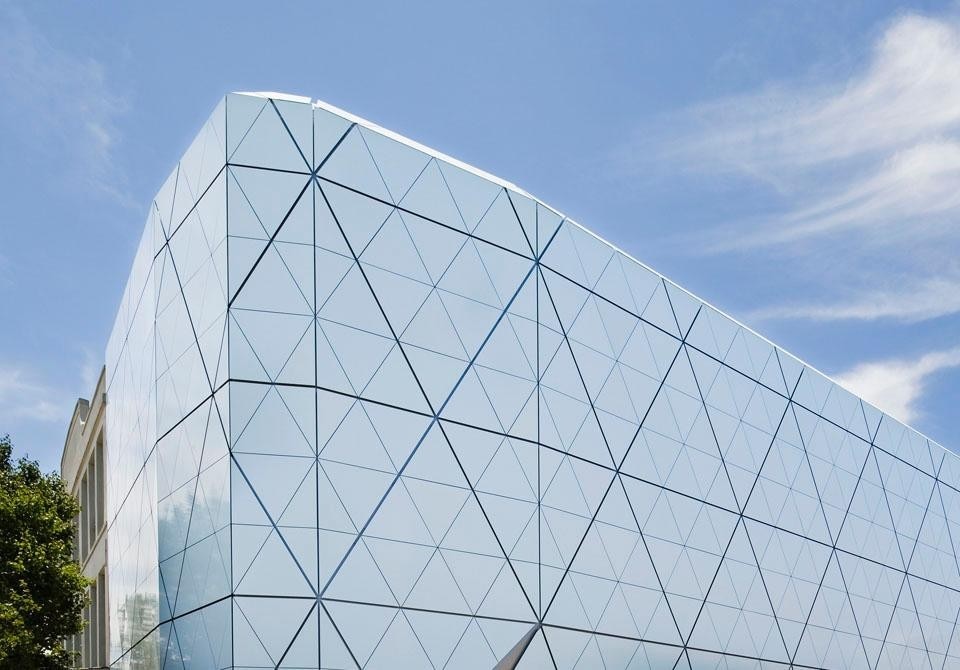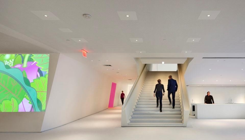"Tanto l'architettura quanto il cinema si occupano della coreografia del movimento e dell'esperienza spaziale", osserva Leeser, che prima di costituire il proprio studio nel 1989 è stato associato nello studio di Peter Eisenman. Il primo schermo in cui i visitatori probabilmente si imbattono è quello che devono attraversare entrando dalla strada. All'ingresso principale le vetrate a piena altezza sono decorate da un motivo a triangoli opachi, cui si sovrappongono vistose scritte dai bordi rosa shocking che tracciano il nome dell'istituzione. Questo velario tipografico è a filo della superficie esterna dell'edificio, in contrasto con le finestre originali profondamente incassate della facciata monumentale storica.