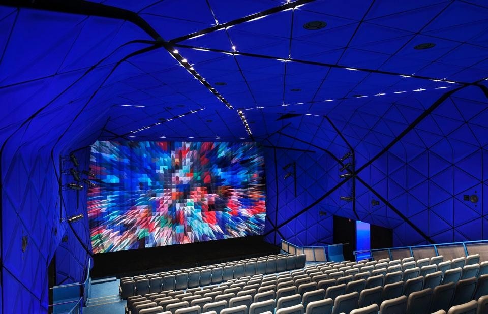 Una luce piacevole filtra dalla corte, ma gli effetti spaziali dell'atrio sono più spiccati dopo il tramonto. Un soffitto inclinato segna nell'atrio il lato inferiore dell'auditorium adiacente, formando una linea affilata dove incontra l'inclinazione opposta del pavimento. Il fascino di questa zona eterea, appena illuminata da lampade nascoste, non sfugge agli adolescenti, che scorrazzano con passione lungo il piano inclinato. Panche e banconi di Corian, lussuosamente lunghi e monolitici, corredano la biglietteria, lo shop e il caffè. Dentro l'auditorium da 264 posti pareti e soffitto di feltro azzurro avvolgono il pubblico come in una capsula, pronti a trasportarli in un mondo altro.