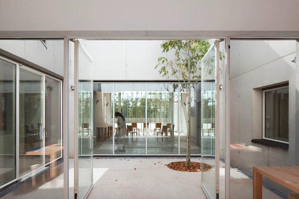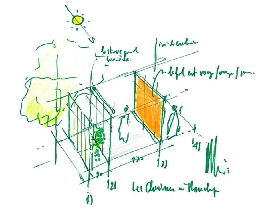 Rispettoso del noli me tangere lecorbusiano, Piano si è ritirato ai piedi della collina, in una posizione defilata anche rispetto al millenario sentiero dei viandanti, senza interferire con la progressiva conquista della cappella dai piedi fino alla cima della risalita.